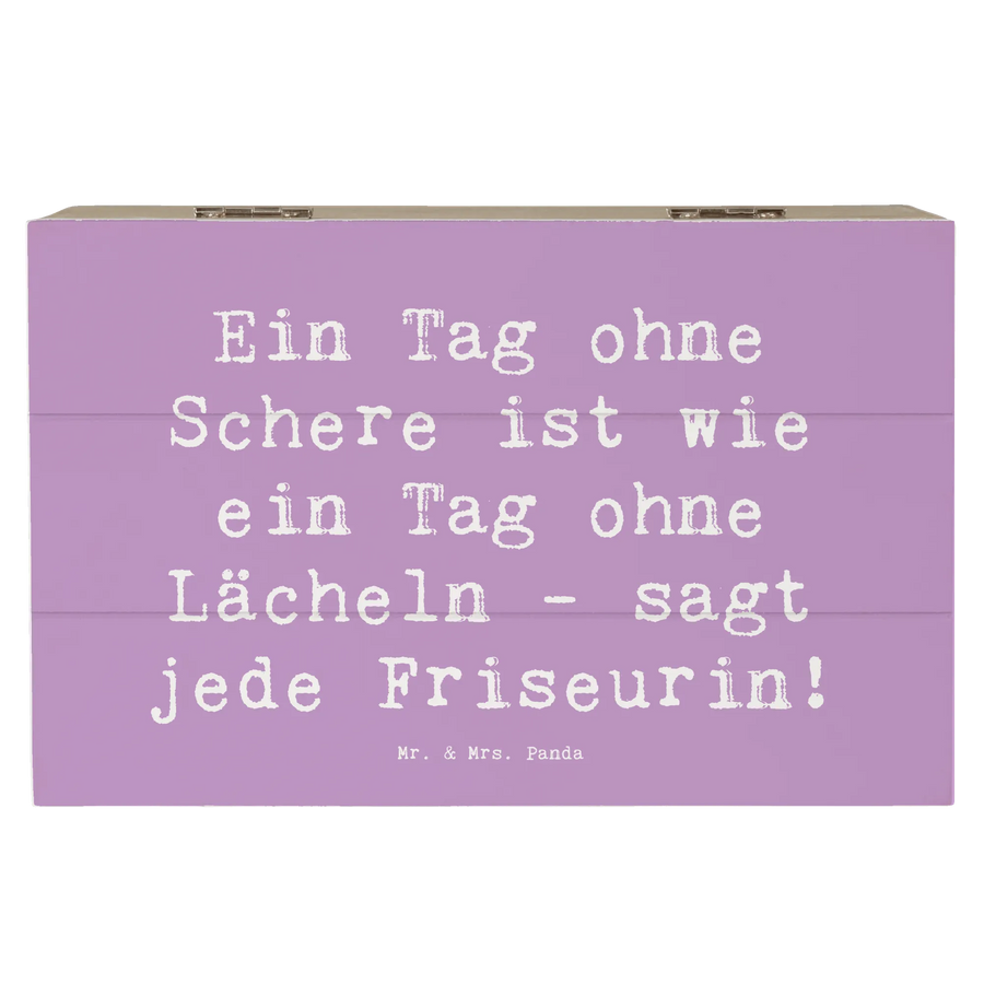 Eine bezaubernde Holzkiste von Mr. & Mrs. Panda – perfekt als Schatzkiste, Erinnerungskiste oder Geschenkbox. Das liebevoll illustrierte Motiv „Friseurin“ mit dem Spruch „Ein Tag ohne Schere ist wie ein Tag ohne Lächeln - sagt jede Friseurin!“ bringt Charme und ein Lächeln in jeden Raum. 🎁