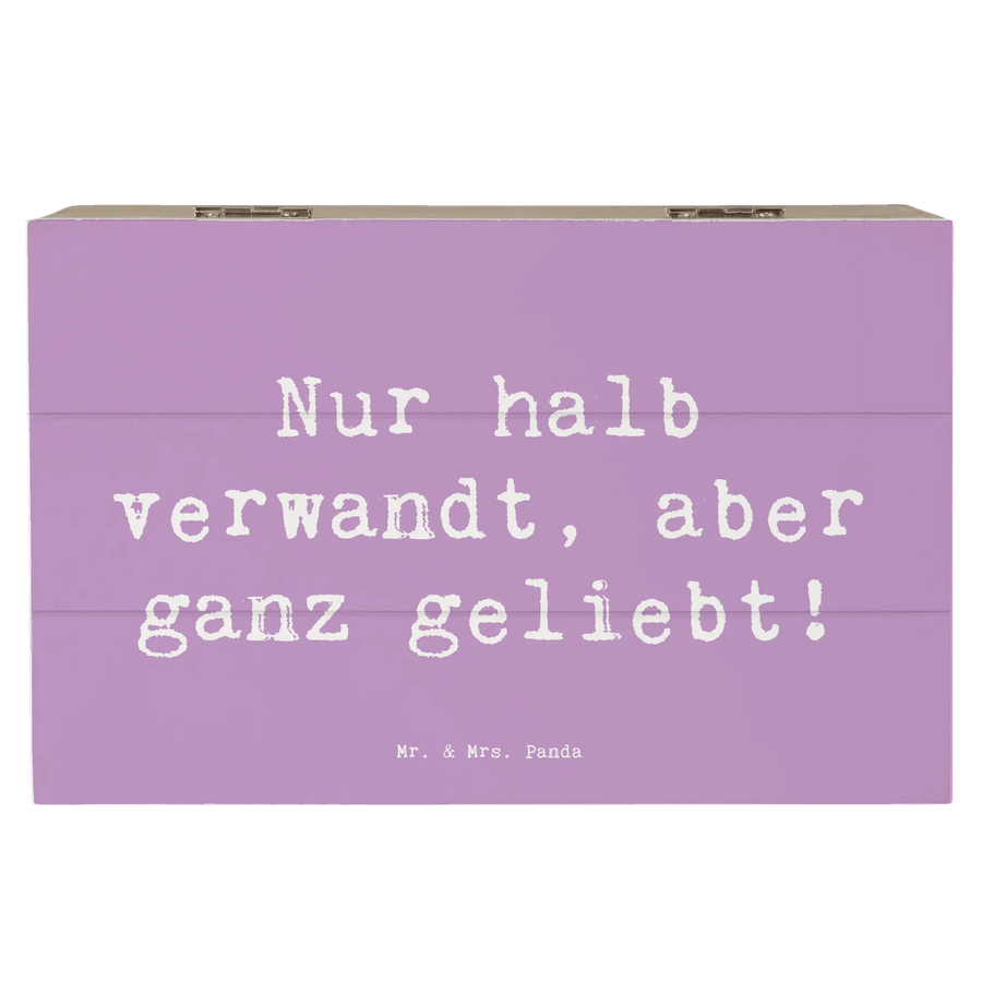 Diese tolle Holzkiste wird mit dem bezaubernden Spruch "Nur halb verwandt, aber ganz geliebt!" bedruckt, was sie zu einem besonders persönlichen Geschenk macht.