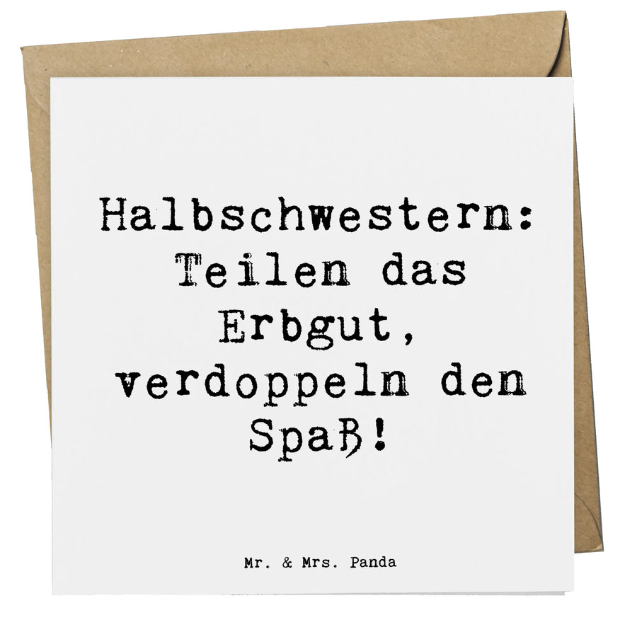 Die Deluxe Karte für Halbschwestern von Mr. & Mrs. Panda ist das perfekte Geschenk für jeden Anlass, der die besondere Beziehung zu deiner Halbschwester feiert. Mit dem charmanten Slogan "Halbschwestern: Teilen das Erbgut, verdoppeln den Spaß!" lädt diese hochwertige Klappkarte dazu ein, deine Gefühle in Worte zu fassen und sie auf stilvolle Weise zu übermitteln. Egal, ob zu einem Geburtstag, einer Hochzeit oder einfach nur als kleine Aufmerksamkeit – diese Karte wird mit Sicherheit ein Lächeln auf das Gesicht deiner Halbschwester zaubern.