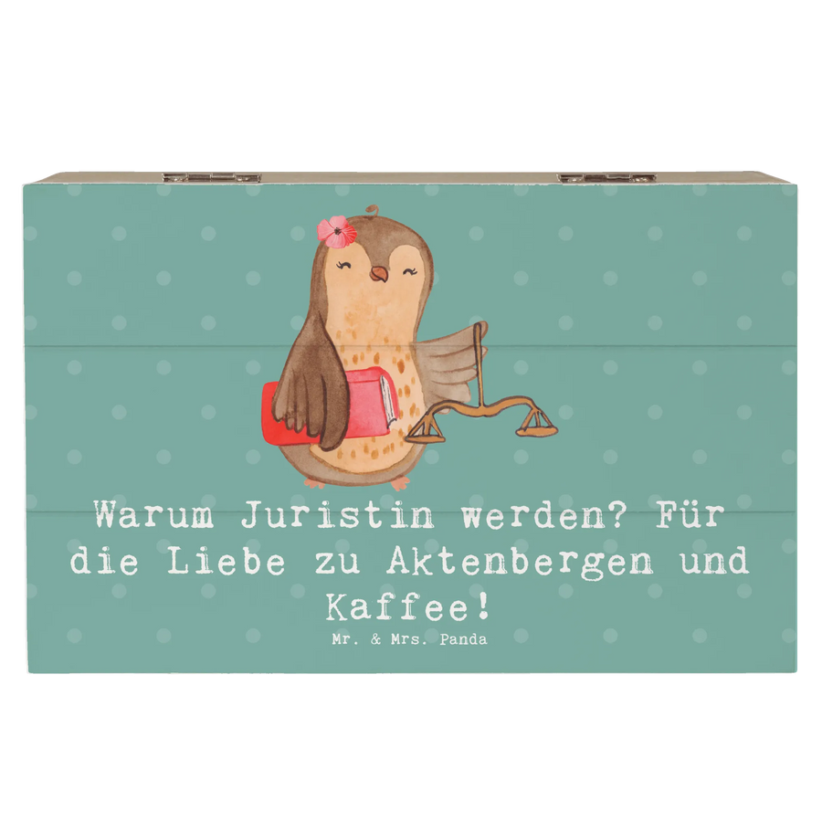 Die Holzkiste Juristin von Mr. & Mrs. Panda ist das perfekte Geschenk für alle, die im juristischen Bereich tätig sind oder eine Leidenschaft für das Recht haben. Diese wunderschöne Kiste ist nicht nur ein Aufbewahrungsort für wertvolle Erinnerungen, sondern auch ein liebevolles Accessoire, das die Liebe zu Aktenbergen und Kaffee mit einem humorvollen Slogan feiert: "Warum Juristin werden? Für die Liebe zu Aktenbergen und Kaffee!"