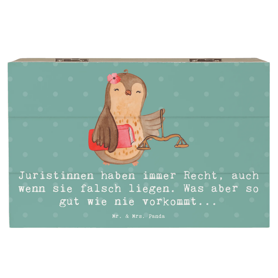 Die wunderschöne Holzkiste von Mr. & Mrs. Panda ist der perfekte Begleiter für alle Juristinnen! Mit dem charmanten Spruch "Juristinnen haben immer Recht, auch wenn sie falsch liegen. Was aber so gut wie nie vorkommt..." lädt diese Kiste dazu ein, wunderschöne Erinnerungen, Dokumente oder Schätze aufzubewahren.