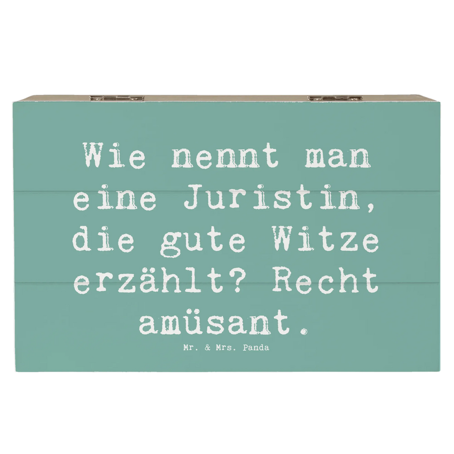 Mit dem witzigen Spruch "Wie nennt man eine Juristin, die gute Witze erzählt? Recht amüsant." ist diese Schatzkiste perfekt für alle, die Humor und ihren Beruf miteinander verbinden wollen.
