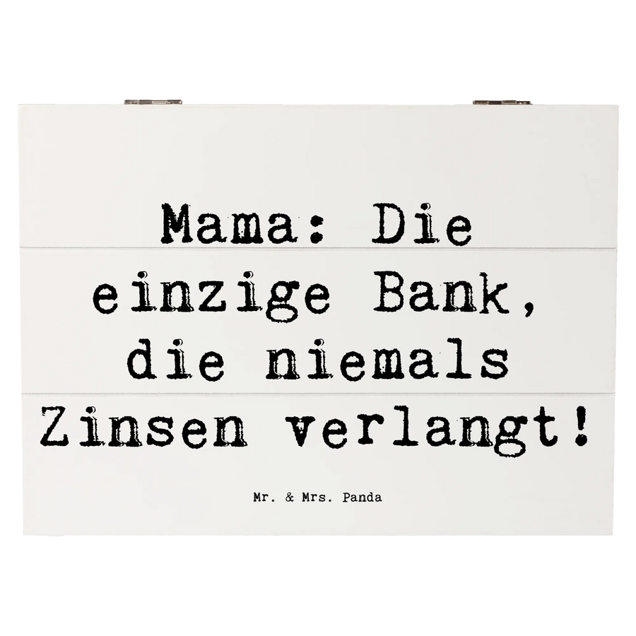 Die wunderschöne Holzkiste von Mr. & Mrs. Panda ist das perfekte Geschenk für jede Mutter und bringt ein Lächeln in ihr Gesicht. Diese Erinnerungskiste ist mehr als nur ein einfacher Aufbewahrungsort – sie ist eine Schatzkiste voller schöner Momente. Egal ob zum Muttertag, zum Geburtstag oder einfach als Dankeschön, diese Holzkiste eignet sich hervorragend, um die wertvollen Schätze Deines Lebens zu bewahren: von den ersten Babysachen über liebenswerte Zeichnungen bis hin zu Fotos von unvergesslichen Familienmomenten. Mit dem liebevollen Motto 'Mama: Die einzige Bank, die niemals Zinsen verlangt!' wird jedes Herz berührt.