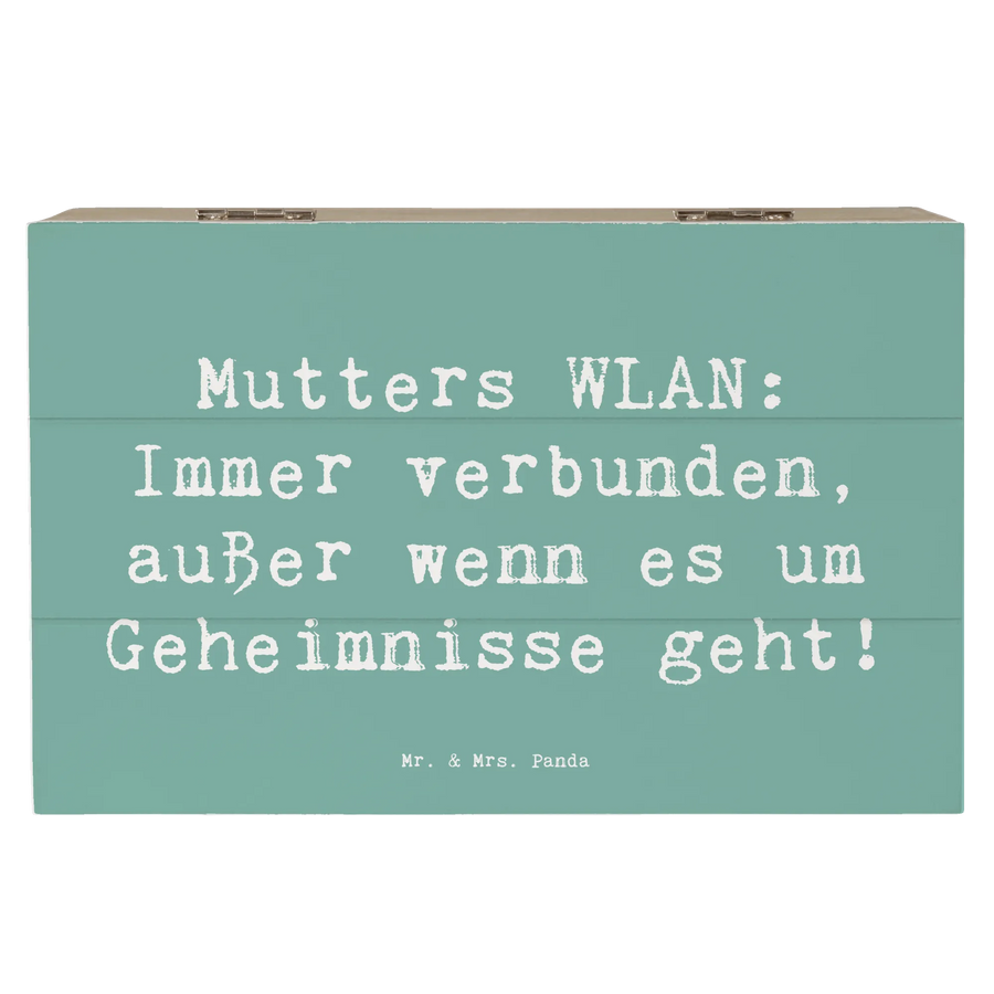 Gefertigt aus robuster Holzfaser sorgt die Kiste nicht nur für eine nachhaltige Aufbewahrung, sondern ist auch ein echter Eyecatcher in jedem Zuhause. Ihre Stabilität und die besonderen Einschlagscharniere ermöglichen ein kinderleichtes Öffnen und Schließen, während die edlen Designs und Sprüche von Mr. & Mrs. Panda das Herz jeder Mutter höher schlagen lassen. Besonders das Motto "Mutters WLAN: Immer verbunden, außer wenn es um Geheimnisse geht!" spricht viele Menschen an und spiegelt die tiefen und oft lustigen Beziehungen zwischen Müttern und ihren Kindern wider.