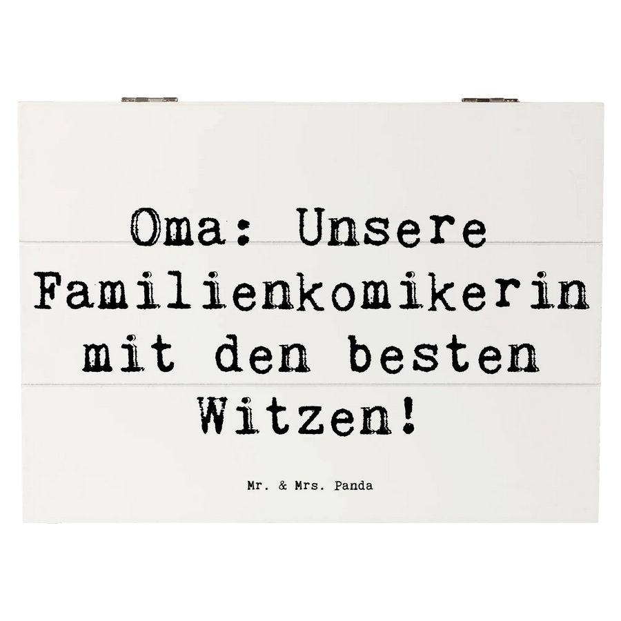 Die schöne Holzkiste von Mr. & Mrs. Panda ist das perfekte Geschenk für Deine liebste Oma! Mit einem liebevollen Motiv und dem charmanten Spruch "Oma: Unsere Familienkomikerin mit den besten Witzen!" stellt diese Kiste nicht nur einen Blickfang dar, sondern bringt auch ein Lächeln auf jedes Gesicht. Diese Holzkiste ist nicht nur hübsch anzusehen, sondern bietet zudem einen idealen Aufbewahrungsort für all die wundervollen Schätze, die Deine Oma über die Jahre gesammelt hat.