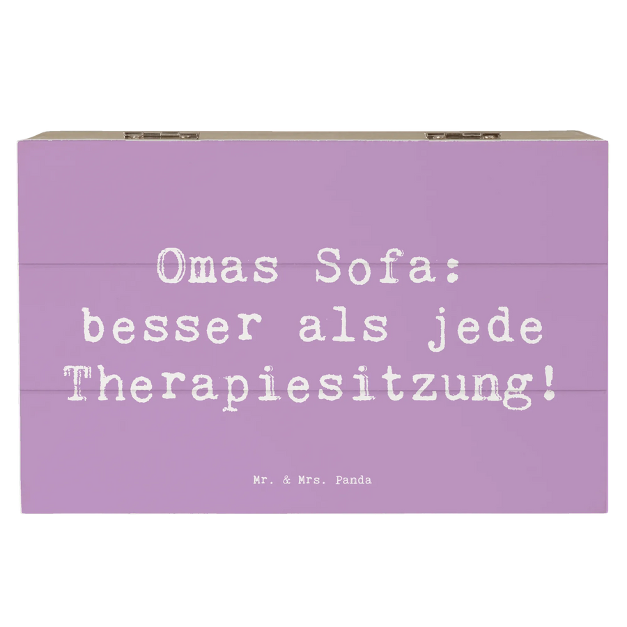 Die wunderschöne Holzkiste von Mr. & Mrs. Panda ist das perfekte Geschenk für jede Oma! Mit dem herzlichen Spruch "Omas Sofa: besser als jede Therapiesitzung!" wird diese Kiste nicht nur zum stilvollen Aufbewahrungsort für all ihre Schätze, sondern auch zu einem besonderen Erinnerungsstück.
