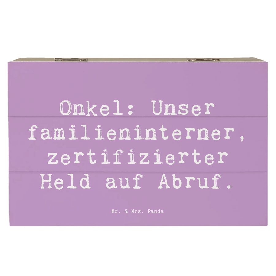 Entdecke die wunderschöne Holzkiste von Mr. & Mrs. Panda, die perfekt für Deinen Onkel ist! Diese besondere Schatzkiste ist nicht nur ein hübsches Deko-Element, sondern auch ein liebevoller Aufbewahrungsort für all die kostbaren Erinnerungen, die Du mit Deinem Onkel teilst. Mit dem charmanten Spruch "Onkel: Unser familieninterner, zertifizierter Held auf Abruf." wird diese Kiste zum idealen Geschenk für Anlässe wie Geburtstagsfeiern, Familienfeiern oder einfach als Dankeschön für alles, was er für Dich getan hat.