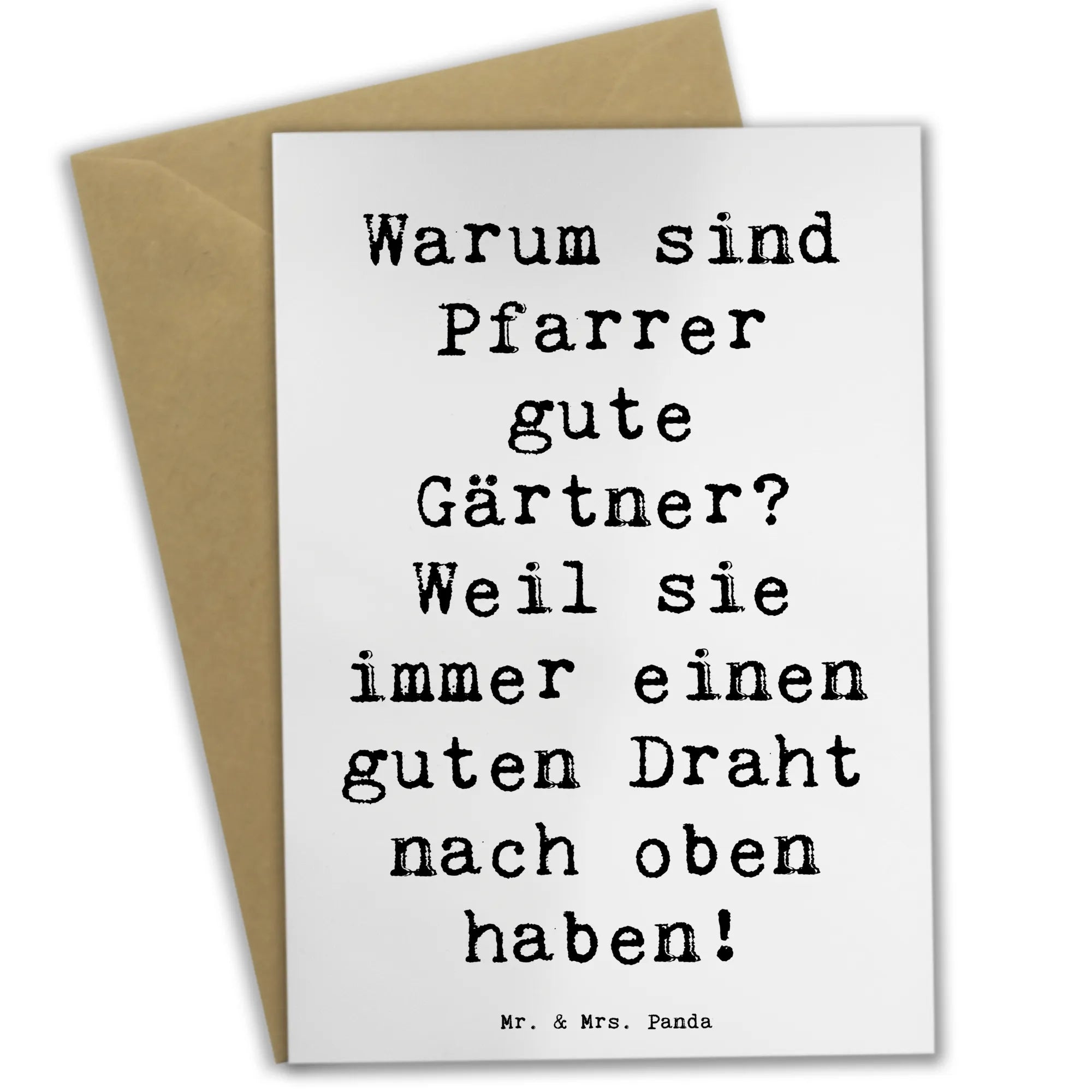 Die zauberhafte Grußkarte "Pfarrer" aus der Berufe-Kollektion von Mr. & Mrs. Panda ist der perfekte Begleiter für besondere Anlässe. Mit einer liebevoll gestalteten Illustration und dem witzigen Spruch "Warum sind Pfarrer gute Gärtner? Weil sie immer einen guten Draht nach oben haben!" bringt diese Karte ein Lächeln auf die Gesichter Deiner Lieben.