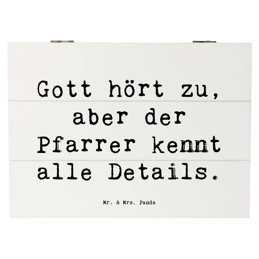Die Holzkiste "Pfarrer" von Mr. & Mrs. Panda ist das perfekte Geschenk für jeden, der seinen Glauben und seine Berufung liebt. Mit einem liebevoll gestalteten Motiv und dem Spruch "Gott hört zu, aber der Pfarrer kennt alle Details" ist diese Kiste mehr als nur eine Aufbewahrungsbox. Sie wird zum wertvollen Aufbewahrungsort für Erinnerungen und besondere Schätze.