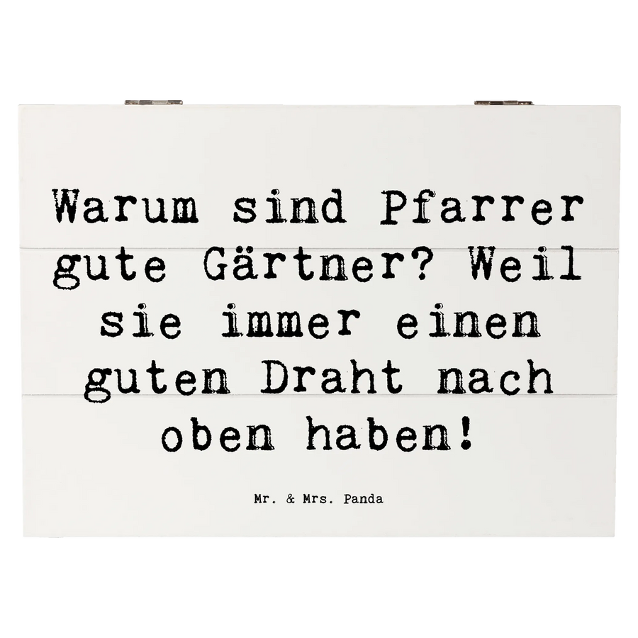 Entdecke die perfekte Holzkiste von Mr. & Mrs. Panda, die nicht nur hübsch aussieht, sondern auch praktisch in Deinem Alltag sein kann! Diese wunderschöne Erinnerungsbox ist mit einem liebevollen Motiv eines Pfarrers verziert und trägt den witzigen Spruch: "Warum sind Pfarrer gute Gärtner? Weil sie immer einen guten Draht nach oben haben!" Sie wird aus robuster Premium Hartfaser gefertigt und eignet sich hervorragend als Aufbewahrungsort für all Deine wichtigen Schätze. Egal, ob es sich um Fotos, Kindheitserinnerungen oder festliche Anlässe wie Kommunion und Konfirmation handelt – diese Kiste bietet ausreichend Platz und ist ein wahrer Hingucker!