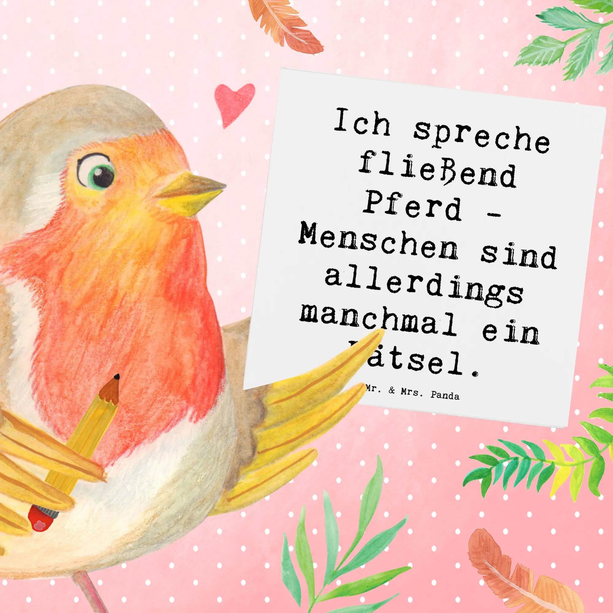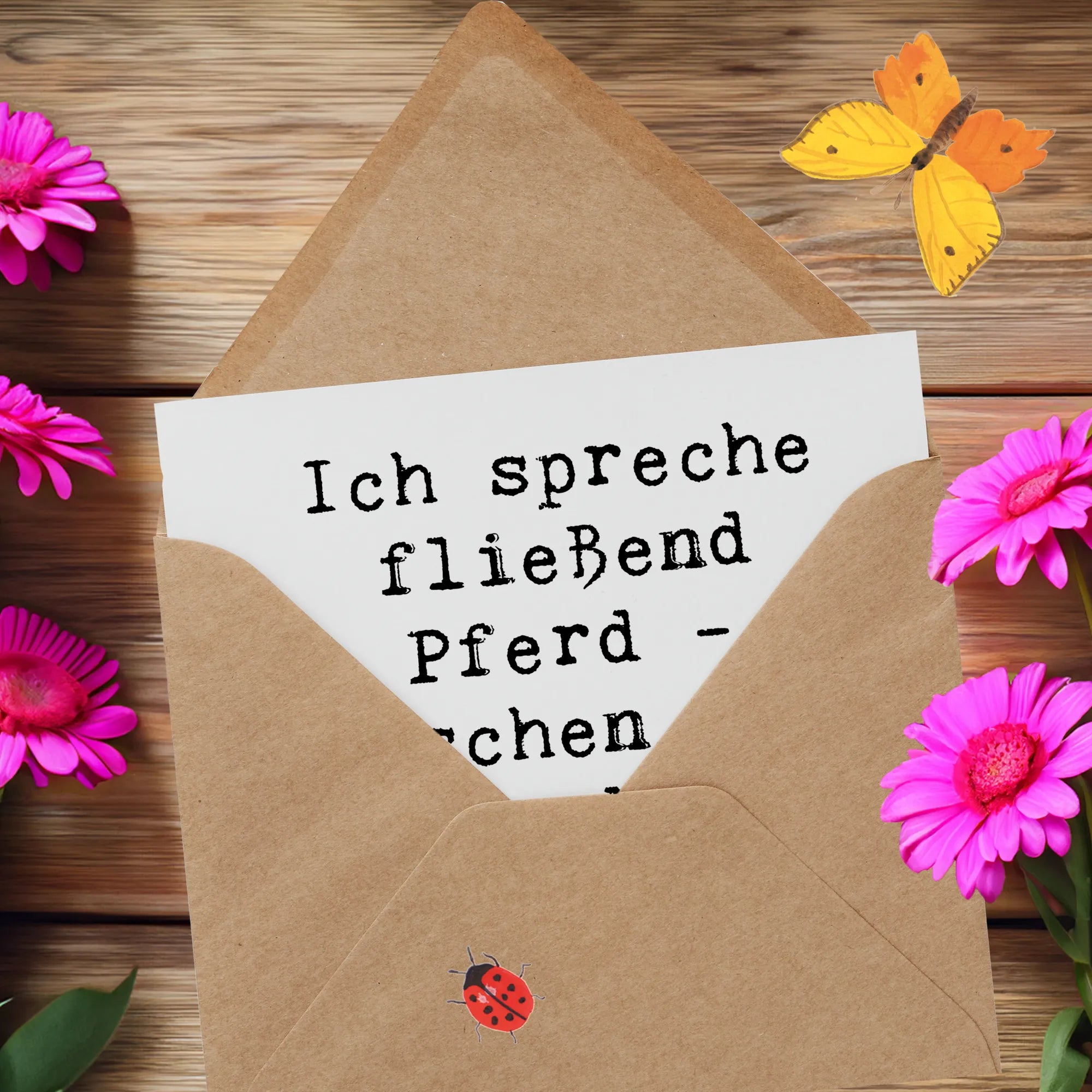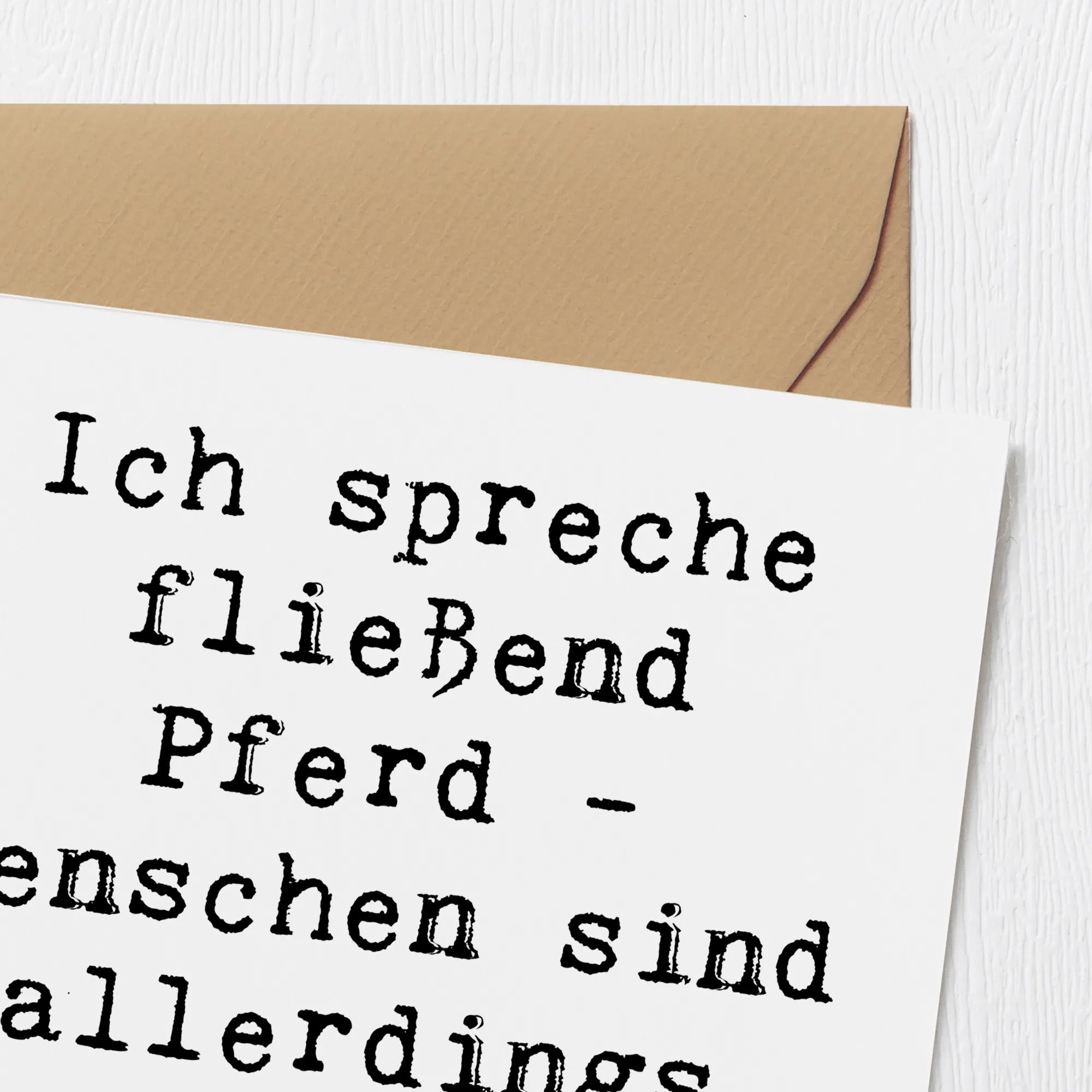 Was macht diese Karte besonders? Das liebevoll gestaltete Motiv mit dem Spruch "Ich spreche fließend Pferd - Menschen sind allerdings manchmal ein Rätsel." ist nicht nur lustig, sondern spricht auch das Herz eines jeden Reiters oder Pferdefreundes an. Es ist ideal für Schwiegermütter, die die Leidenschaft ihrer Kinder für den Reitsport unterstützen, oder für Freunde, die gerne beim Reiten entspannen.