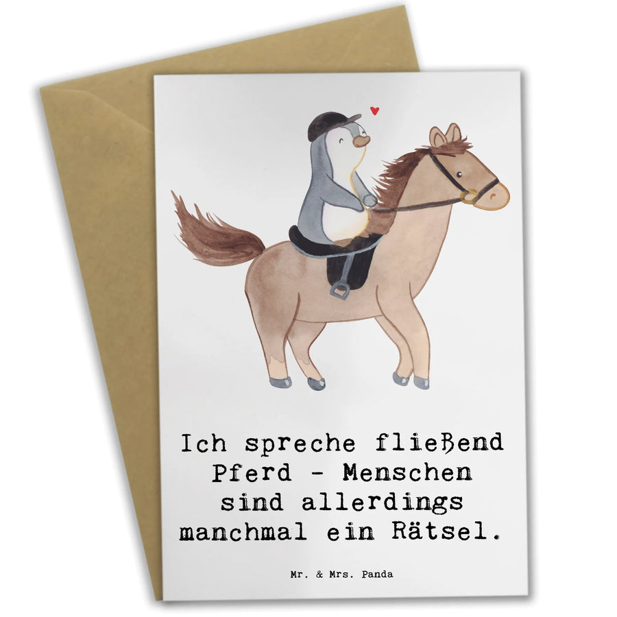Sie ist nicht nur eine wundervolle Möglichkeit, Glückwünsche zu übermitteln, sondern auch eine kleine Liebeserklärung an die Pferdewelt. Mit dem Spruch "Ich spreche fließend Pferd - Menschen sind allerdings manchmal ein Rätsel" bringt die Karte ein Lächeln auf die Gesichter der Reiter und Pferdeliebhaber.