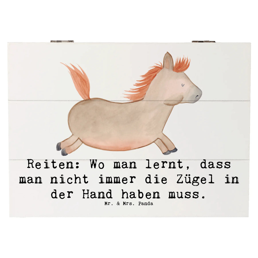 Diese wunderschöne Holzkiste von Mr. & Mrs. Panda ist das ideale Geschenk für alle Pferdeliebhaber und Reitsport-Enthusiasten. Mit ihrem bezaubernden Motiv "Reiten: Wo man lernt, dass man nicht immer die Zügel in der Hand haben muss" zieht sie garantiert alle Blicke auf sich.