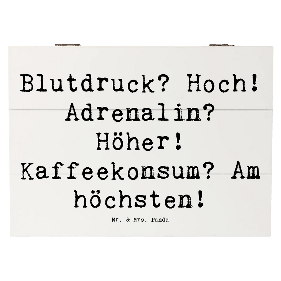 Holzkiste Spruch Blutdruck? Hoch! Adrenalin? Höher! Kaffeekonsum? Am höchsten! - 25 x 18 cm - Weiß