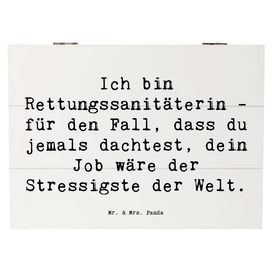 Entdecke die wundervolle Holzkiste "Ich bin Rettungssanitäterin – für den Fall, dass du jemals dachtest, dein Job wäre der Stressigste der Welt" von Mr. & Mrs. Panda! Diese einzigartige Kiste ist nicht nur eine praktische Aufbewahrungslösung, sondern auch ein liebevolles Geschenk für all die Heldinnen und Helden, die im Rettungsdienst tätig sind.