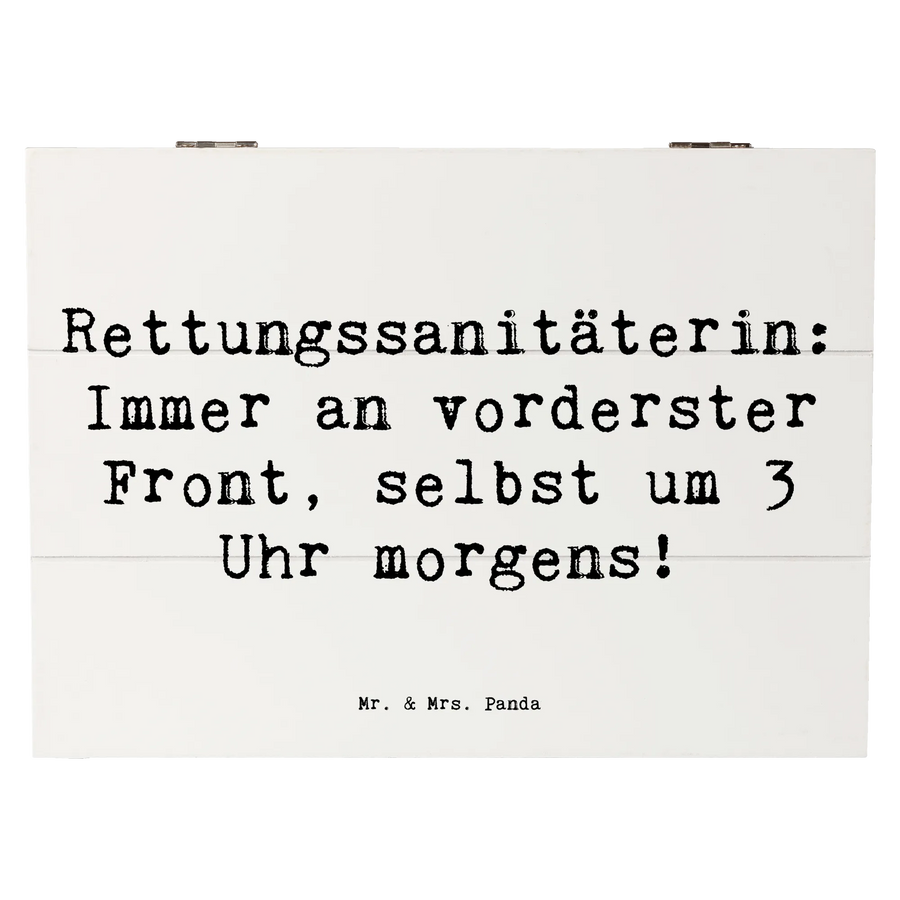 Die wunderschöne Holzkiste von Mr. & Mrs. Panda mit dem Motiv "Rettungssanitäterin: Immer an vorderster Front, selbst um 3 Uhr morgens!" ist das perfekte Geschenk für all jene, die sich in diesem wichtigen Beruf engagieren.