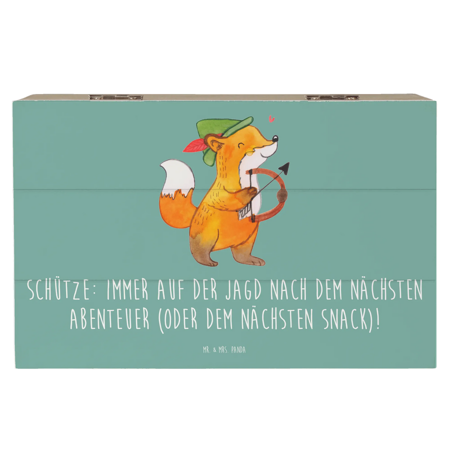 Die wunderschöne Holzkiste mit dem motivierenden Design "Schütze: Immer auf der Jagd nach dem nächsten Abenteuer (oder dem nächsten Snack)!" von Mr. & Mrs. Panda ist das perfekte Geschenk für alle, die im Zeichen des Schützen geboren sind.