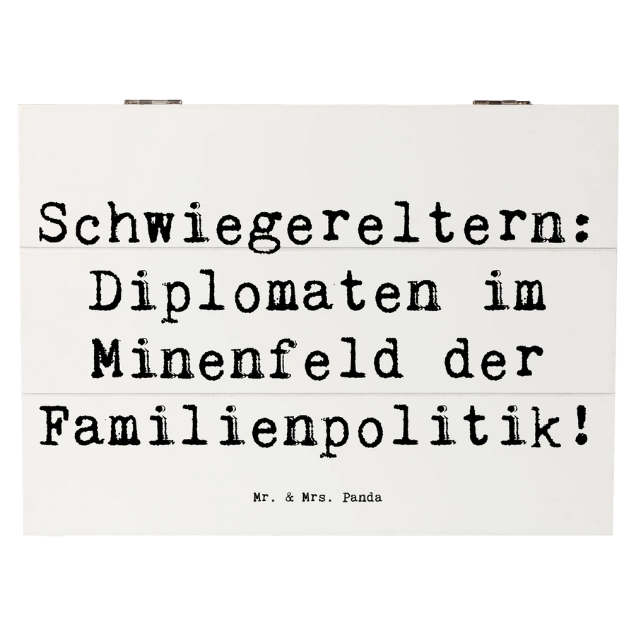 Du suchst das perfekte Geschenk für deine Schwiegereltern? Dann ist diese wunderschöne Holzkiste von Mr. & Mrs. Panda genau das Richtige! Mit dem liebevollen Spruch "Schwiegereltern: Diplomaten im Minenfeld der Familienpolitik!" ist sie nicht nur ein echter Hingucker, sondern auch eine ganz besondere Wertschätzung an die Eltern deines Partners oder deiner Partnerin.