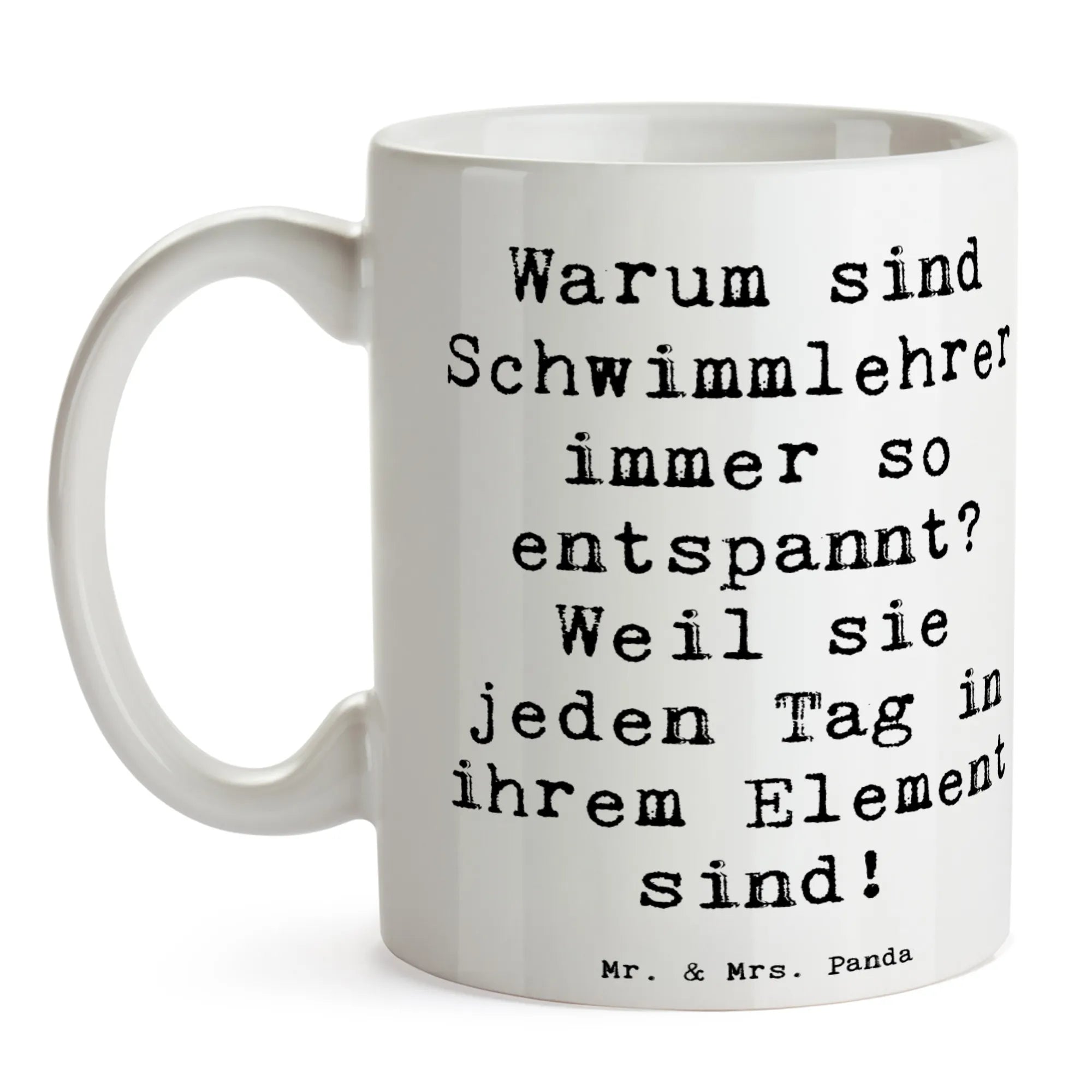 Das perfekte Geschenk für Schwimmlehrer: Du suchst eine persönliche, witzige und zugleich praktische Geschenkidee? Unsere Mr. & Mrs. Panda Tasse Schwimmlehrer aus der Berufe-Kollektion ist genau das Richtige. Mit dem liebevollen Spruch „Warum sind Schwimmlehrer immer so entspannt? Weil sie jeden Tag in ihrem Element sind!“ bringst Du jeden Schwimmtrainer zum Schmunzeln – ideal zum Geburtstag, als Abschiedsgeschenk, zum Danke sagen nach dem Kurs oder als kleines Mitbringsel.