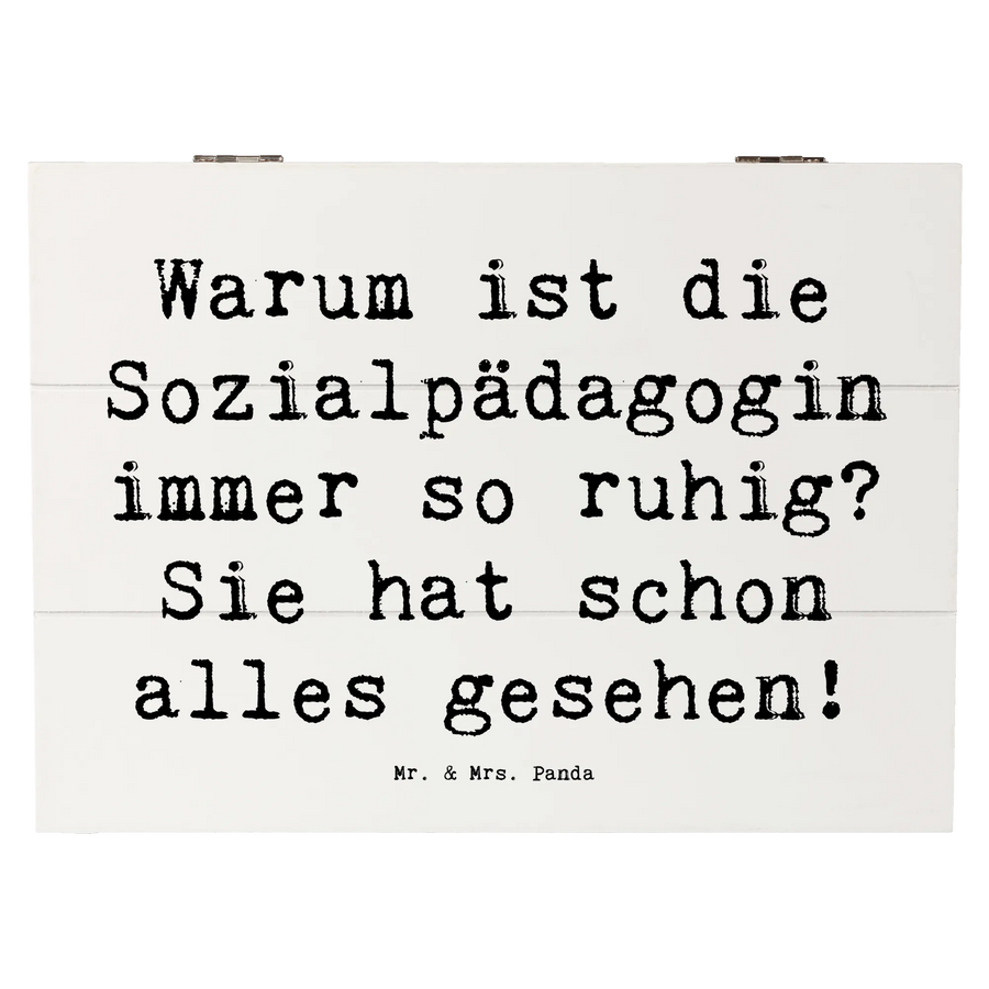 Holzkiste Spruch Warum ist die Sozialpädagogin immer so ruhig? Sie hat schon alles gesehen! - 25 x 18 cm - Weiß
