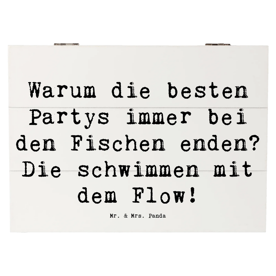 Die Einschlagscharniere ermöglichen ein einfaches Öffnen und Schließen der Kiste und machen sie besonders benutzerfreundlich. Mit ihrem entzückenden Design aus einer liebevollen Auswahl an handgezeichneten Motiven und Sprüchen ist diese Holzkiste nicht nur funktional, sondern auch ein wahrer Hingucker. Sie enthält das Motto, das für alle Fische spricht: 'Warum die besten Partys immer bei den Fischen enden? Die schwimmen mit dem Flow!'