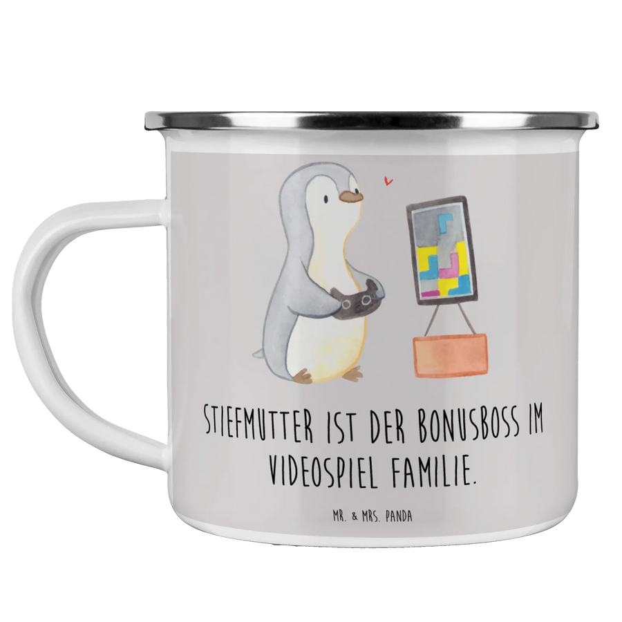 Die wunderschöne und beständige Camping Emaille Tasse von Mr. & Mrs. Panda ist das perfekte Geschenk für alle Stiefmütter und Familienmitglieder, die Outdoor lieben. Mit dem charmanten Spruch "Stiefmutter ist der Bonusboss im Videospiel Familie." bringt diese Tasse ein Lächeln in jeden Campingausflug oder den gemütlichen Nachmittagskaffee auf der Terrasse. Sie ist nicht nur superleicht und praktisch, sondern auch aus kratzfester Emaille gefertigt, was sie besonders langlebig macht.
