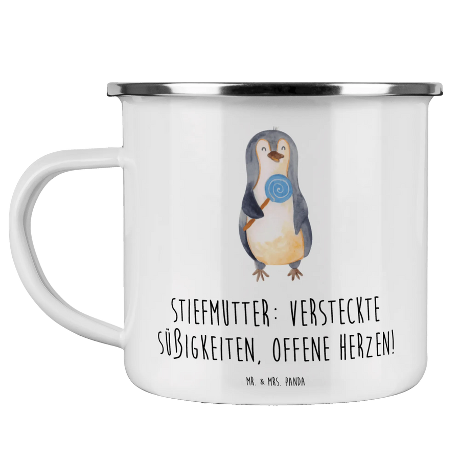 Die Camping Emaille Tasse von Mr. & Mrs. Panda mit dem liebevollen Motiv "Stiefmutter: Versteckte Süßigkeiten, offene Herzen!" ist das perfekte Geschenk für all jene, die eine Stiefmutter haben oder selbst eine Stiefmutter sind.
