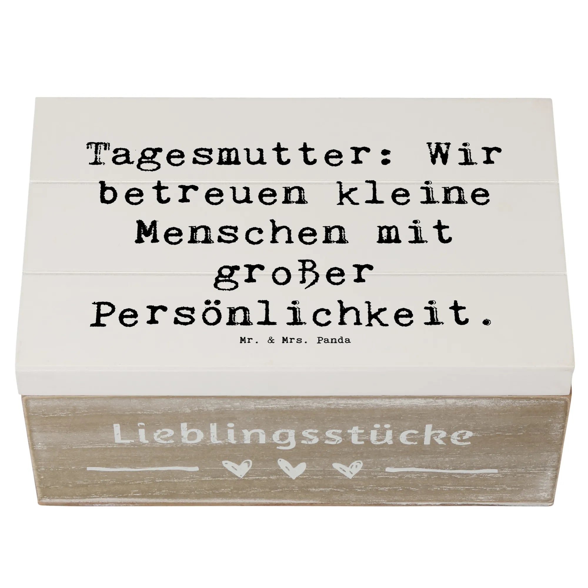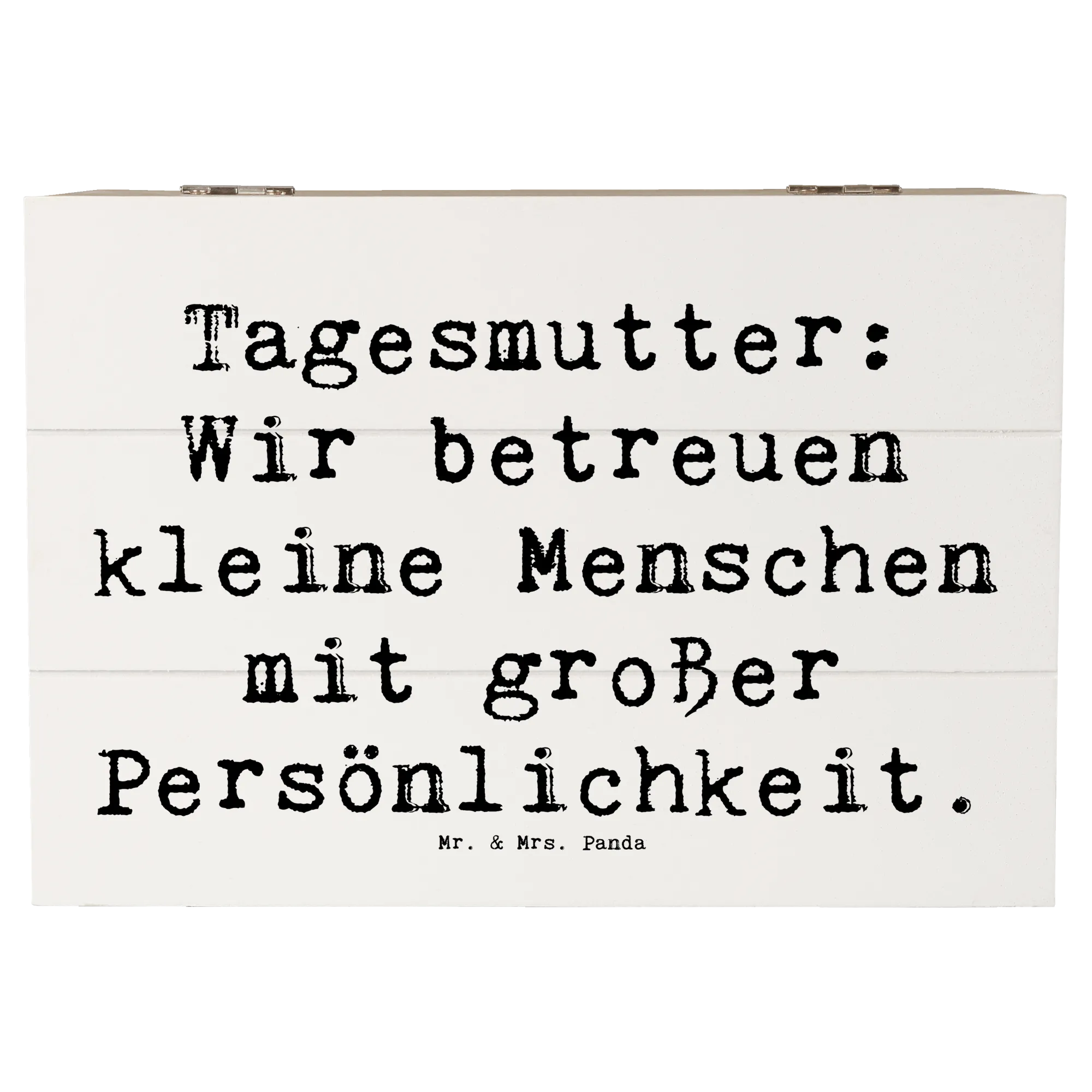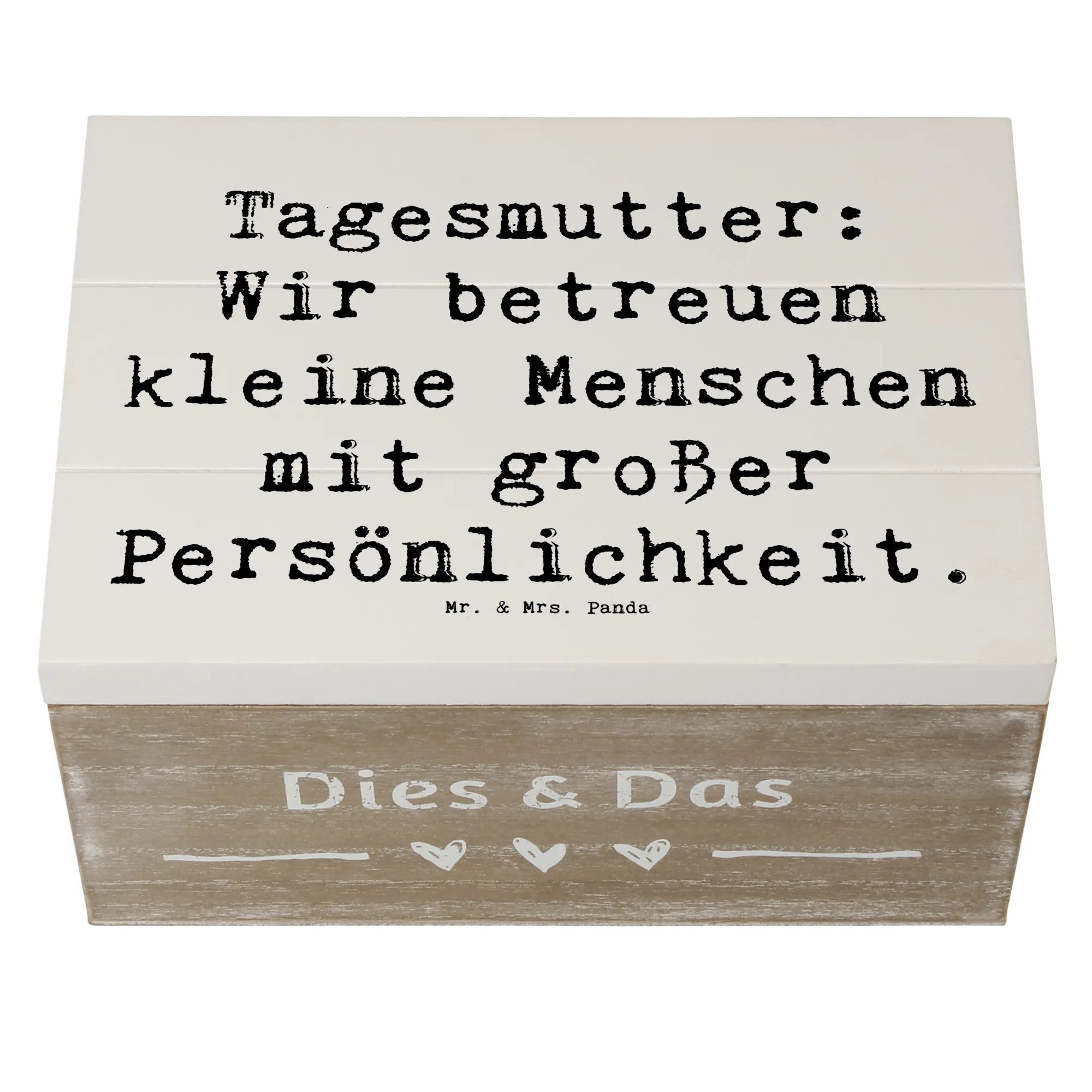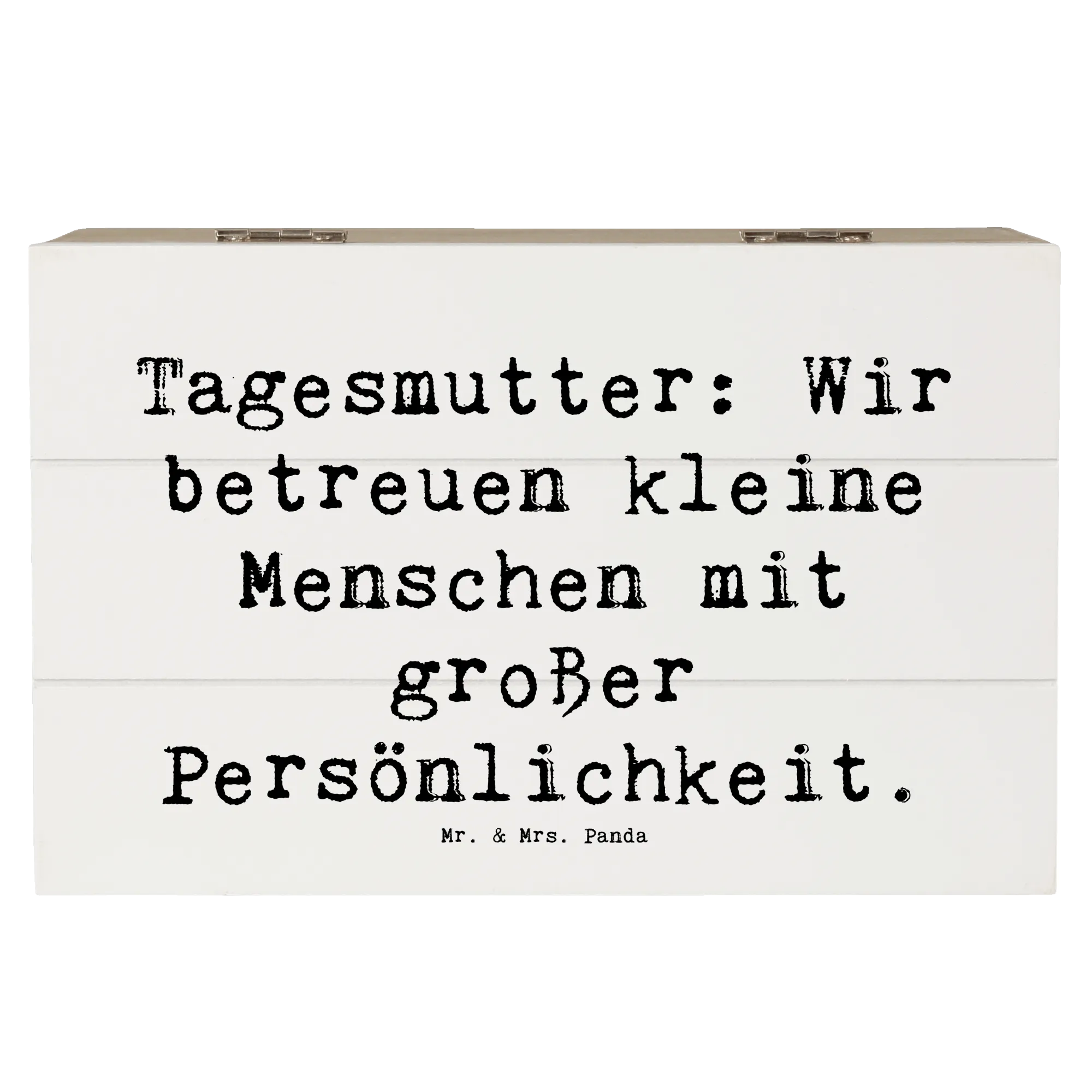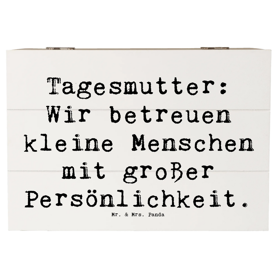 Eine wunderschöne Holzkiste von Mr. & Mrs. Panda, perfekt für die herzliche Tagesmutter in deinem Leben. Diese aus stabiler Premium Hartfaser gefertigte Erinnerungskiste bietet dir nicht nur einen stilvollen Aufbewahrungsort für die Schätze Deiner kleinen Schützlinge, sondern ist auch ein echter Hingucker in jedem Raum. Mit dem liebevollen Spruch "Tagesmutter: Wir betreuen kleine Menschen mit großer Persönlichkeit." schaffst Du eine ganz besondere Verbindung zu den kleinen Persönlichkeiten, die Du betreust.