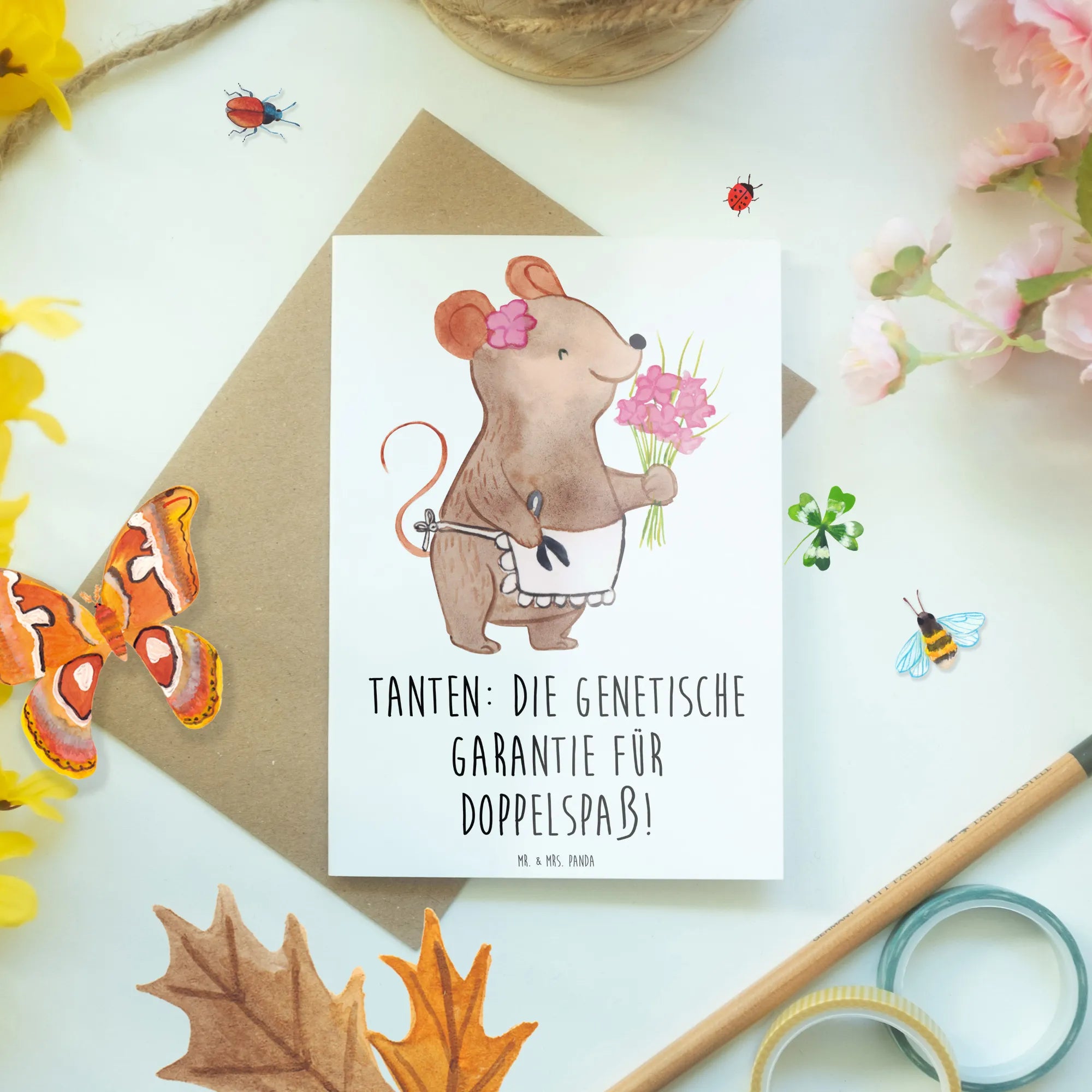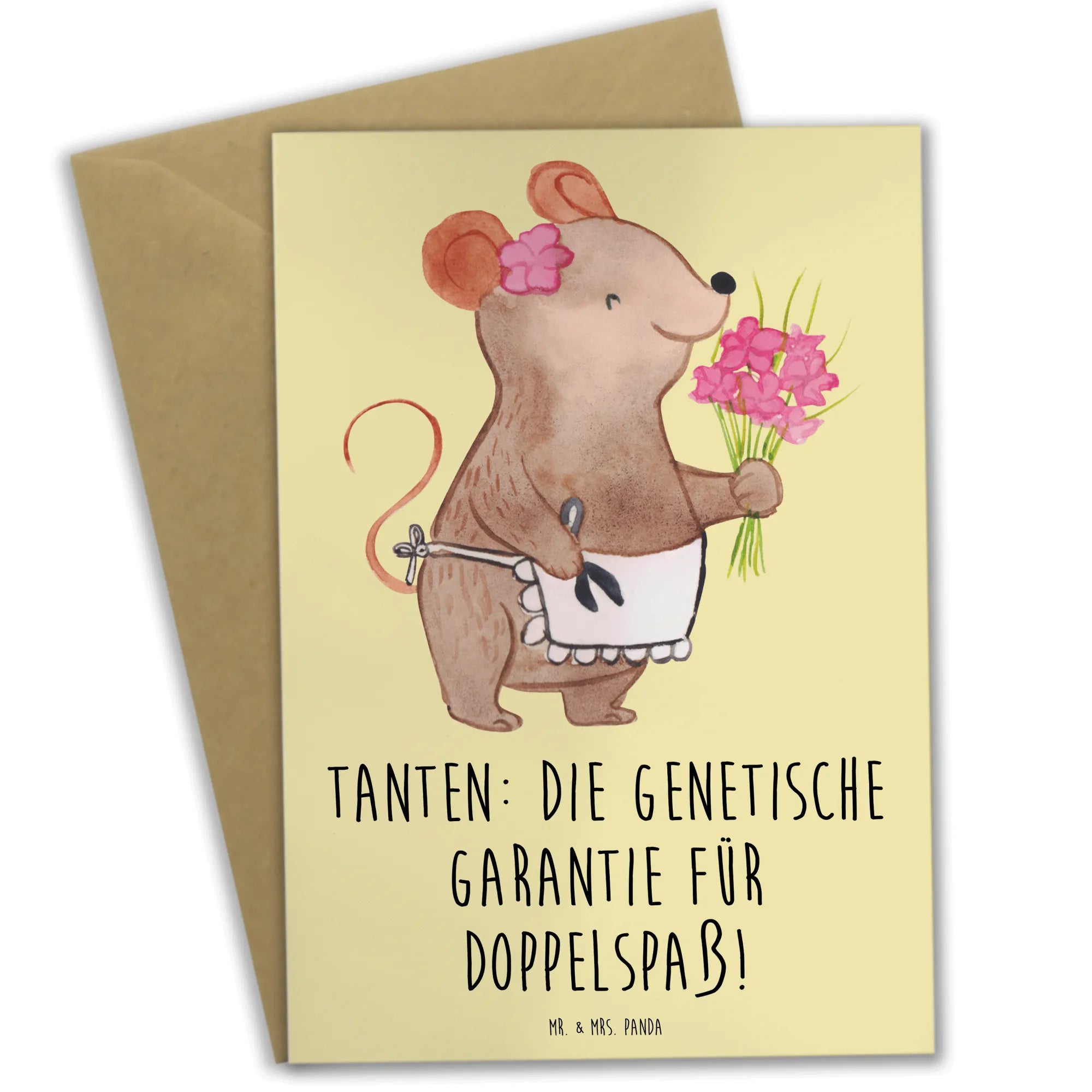 Du suchst das perfekte Geschenk für Deine Tante? Diese zauberhafte Grußkarte von Mr. & Mrs. Panda ist genau das Richtige! Mit liebevollen Motiven und dem witzigen Spruch "Tanten: Die genetische Garantie für Doppelspaß!" zaubert diese Karte nicht nur ein Lächeln auf das Gesicht Deiner Tante, sondern zeigt auch, wie besonders die Beziehung zu ihr ist.