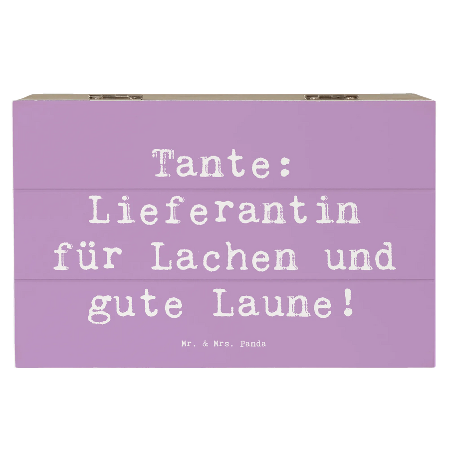Entdecke die wunderschöne Holzkiste von Mr. & Mrs. Panda mit dem liebevollen Motiv 'Tante: Lieferantin für Lachen und gute Laune!'. Diese Erinnerungskiste ist nicht nur ein praktischer Aufbewahrungsort für besondere Schätze, sondern auch ein tolles Geschenk für deine Tante, Nichte, Neffen oder für die gesamte Familie.