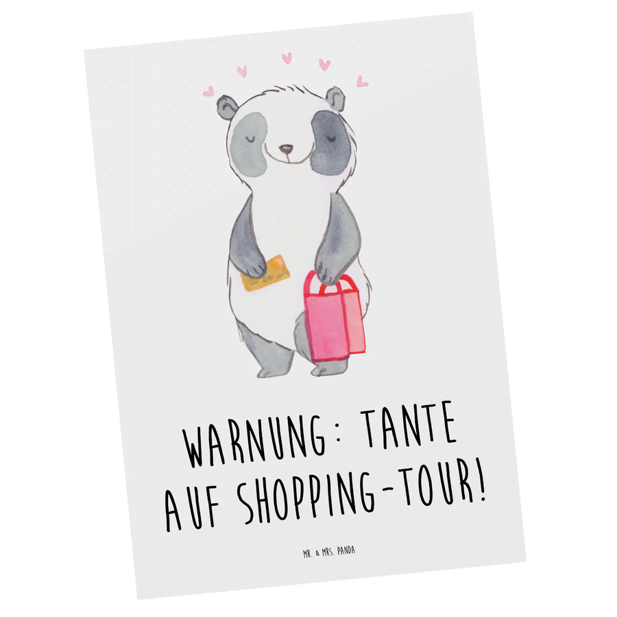 Entdecke die bezaubernde Postkarte 'Warnung: Tante auf Shopping-Tour!' von Mr. & Mrs. Panda, perfekt für alle, die eine besondere Beziehung zu ihren Tanten haben.
