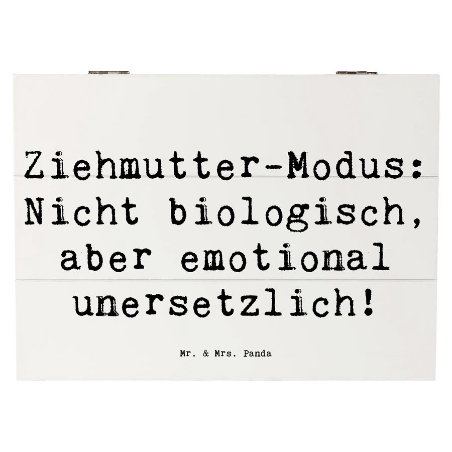 Du suchst nach dem perfekten Geschenk für die Ziehmutter, die in deinem Leben eine besondere Rolle spielt? Unsere wunderschöne Holzkiste von Mr. & Mrs. Panda ist genau das richtige Geschenk, um Dankbarkeit und Wertschätzung für diese einzigartige Frau auszudrücken. Mit dem Spruch "Ziehmutter-Modus: Nicht biologisch, aber emotional unersetzlich!" wird diese Erinnerungskiste zu einem ganz besonderen Aufbewahrungsort für kostbare Schätze und Erinnerungen. Egal, ob du sie für die Aufbewahrung von Erinnerungen an die Kindheit, Fotos, Briefe oder kleine Geschenke nutzen möchtest – die praktische Kiste bietet ausreichend Platz und einen stabilen Halt.