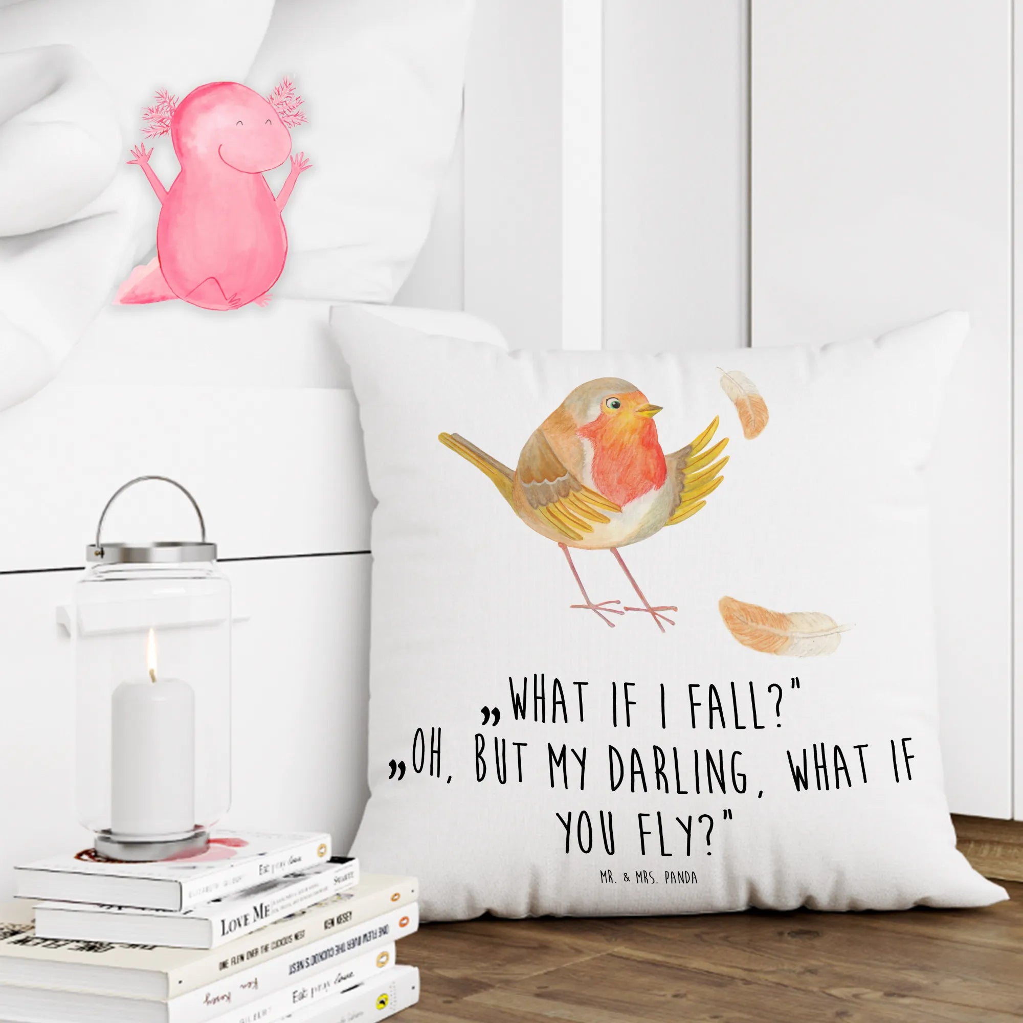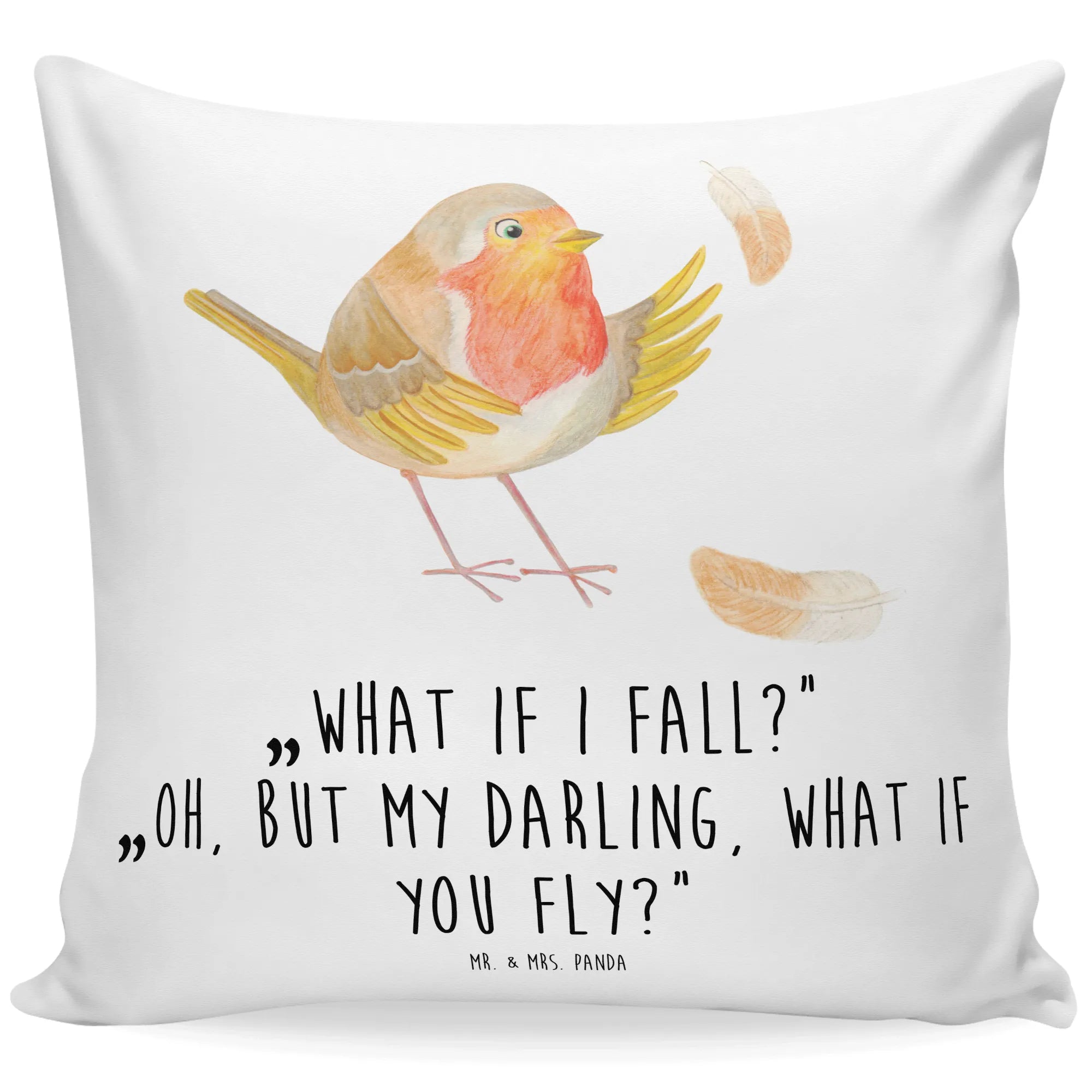 Das wunderschöne 40x40 Kissen Rotkehlchen mit Federn aus der beliebten Small World Kollektion von Mr. & Mrs. Panda ist das perfekte Geschenk für alle, die ihren Wohnraum mit einem Hauch von Natur und Inspiration verschönern möchten. Mit dem niedlichen Motiv eines Rotkehlchens, umgeben von bunten Federn, zaubert dieses Kissen nicht nur ein Lächeln auf dein Gesicht, sondern inspiriert dich auch mit dem wunderbaren Spruch: „What if I fall? Oh, but my darling, what if you fly?“ Dieses Zitat erinnert uns daran, dass Mut und das Streben nach unseren Träumen uns zu neuen Höhen führen können.