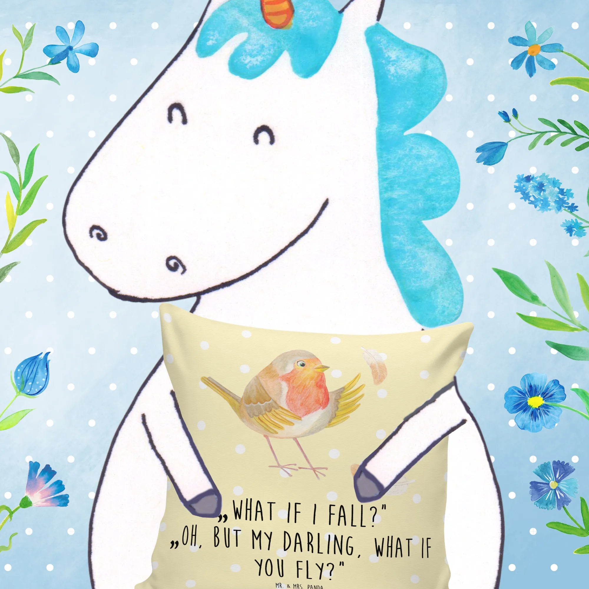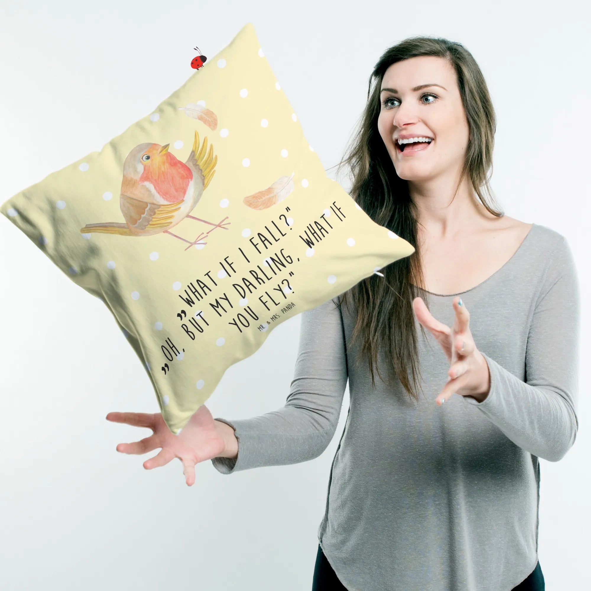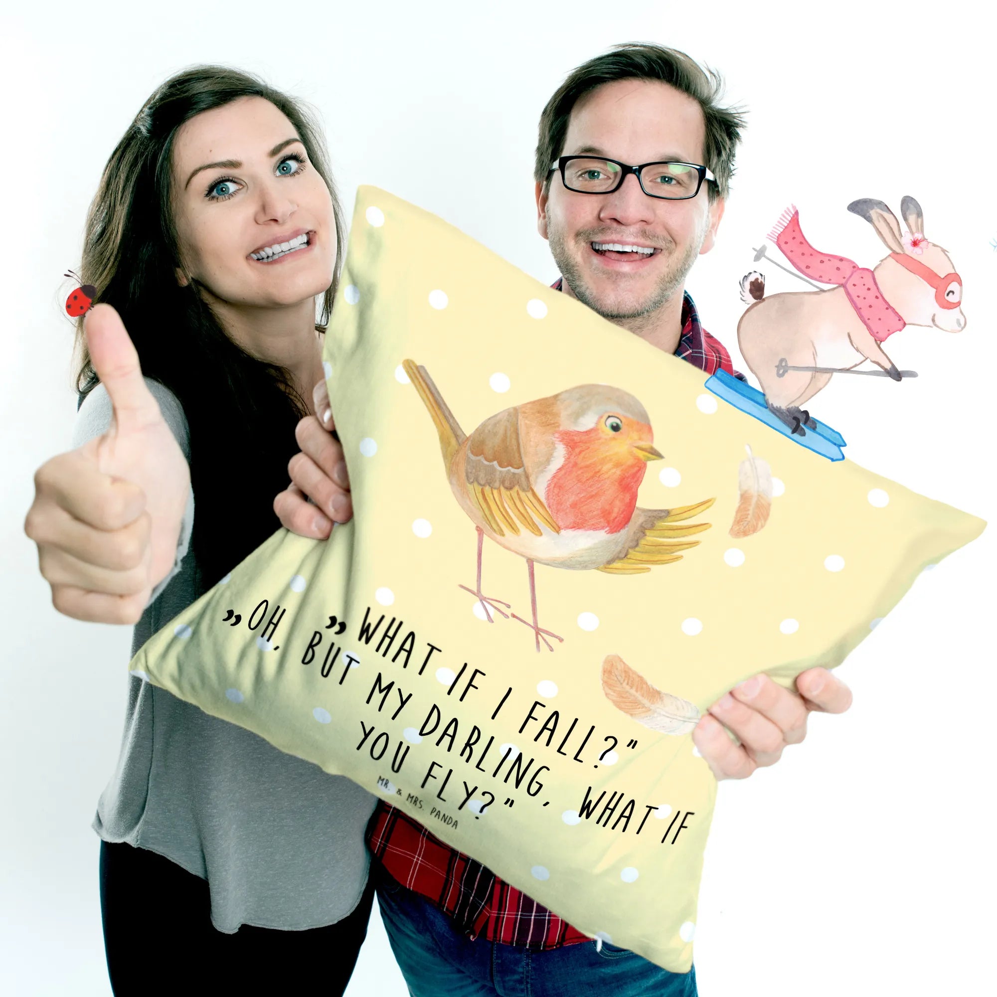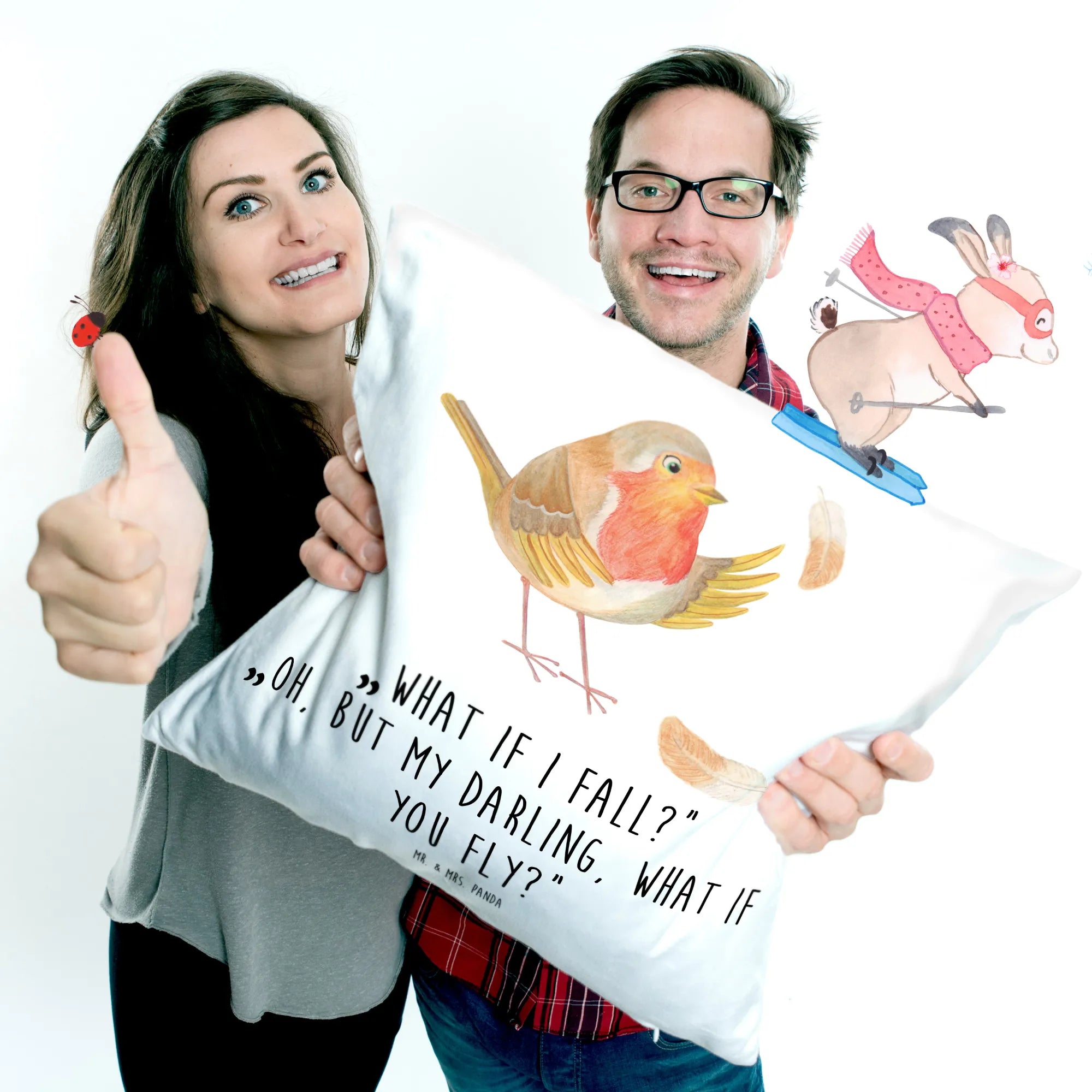 Besonders toll ist, dass das Kissen auch eine tolle Geschenkidee für verschiedene Anlässe ist. Ob zum Geburtstag, zu Weihnachten oder einfach als liebevolles Mitbringsel für einen Freund – das Rotkehlchen-Kissen sorgt garantiert für ein Lächeln. Es ist ideal für Vogel-Liebhaber, Tierfreunde oder einfach Menschen, die sich ein wenig Lebensfreude ins Haus holen möchten. Ein besonderes Detail ist der Slogan: „What if I fall? Oh, but my darling, what if you fly?“ Dieser Mut-Mach-Spruch bringt eine inspirierende Botschaft in dein Zuhause. Mit der Small World Kollektion von Mr. & Mrs. Panda holst du dir ein Stück Lebensfreude in dein Leben und schaffst eine Wohlfühloase. Lasse dich von der Magie der Tierwelt verzaubern und genieße die kleinen Dinge im Leben mit diesem bezaubernden Kissen.