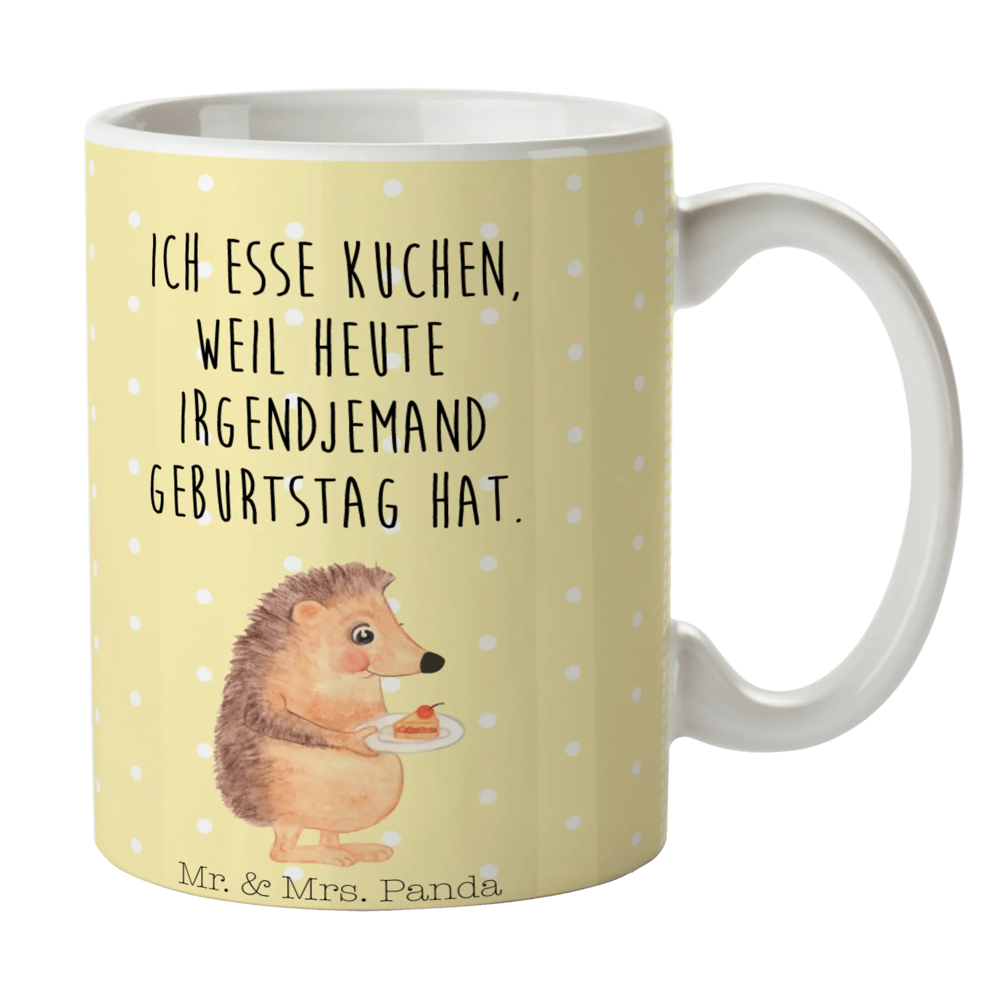Schenke Freude und gute Laune mit dieser besonderen Tasse, denn jeder Moment mit einem Stück Kuchen wird noch schöner mit dem Igel von Mr. & Mrs. Panda! Und vergiss nicht, das Motto: 'Ich esse Kuchen, weil heute irgendjemand Geburtstag hat.' passt zu jedem Anlass.