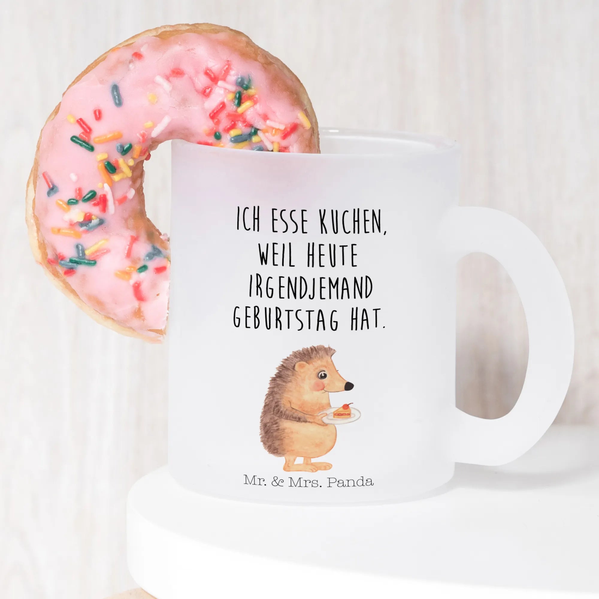 Entdecken Sie mit dem niedlichen Igel mit Kuchenstück von Mr. & Mrs. Panda eine Welt, in der jeden Tag gefeiert wird – einfach, weil wir es können. Der Igel in seiner entzückenden Schürze, der begeistert ein Stück Kuchen hält, ist eine Ode an die Freuden des Backens und des Beisammenseins. Der ihn umgebende Spruch, 'Ich esse Kuchen, weil heute irgendjemand Geburtstag hat', ruft uns dazu auf, die schönen Momente des Lebens zu ergreifen und jeden Tag als potenzielle Party zu betrachten. Dieses Motiv ist ein zauberhafter Reminder daran, dass Glück oft in einem einfachen Stück Kuchen gefunden werden kann und dass Freude geteilt werden sollte, wann immer sich die Gelegenheit bietet.