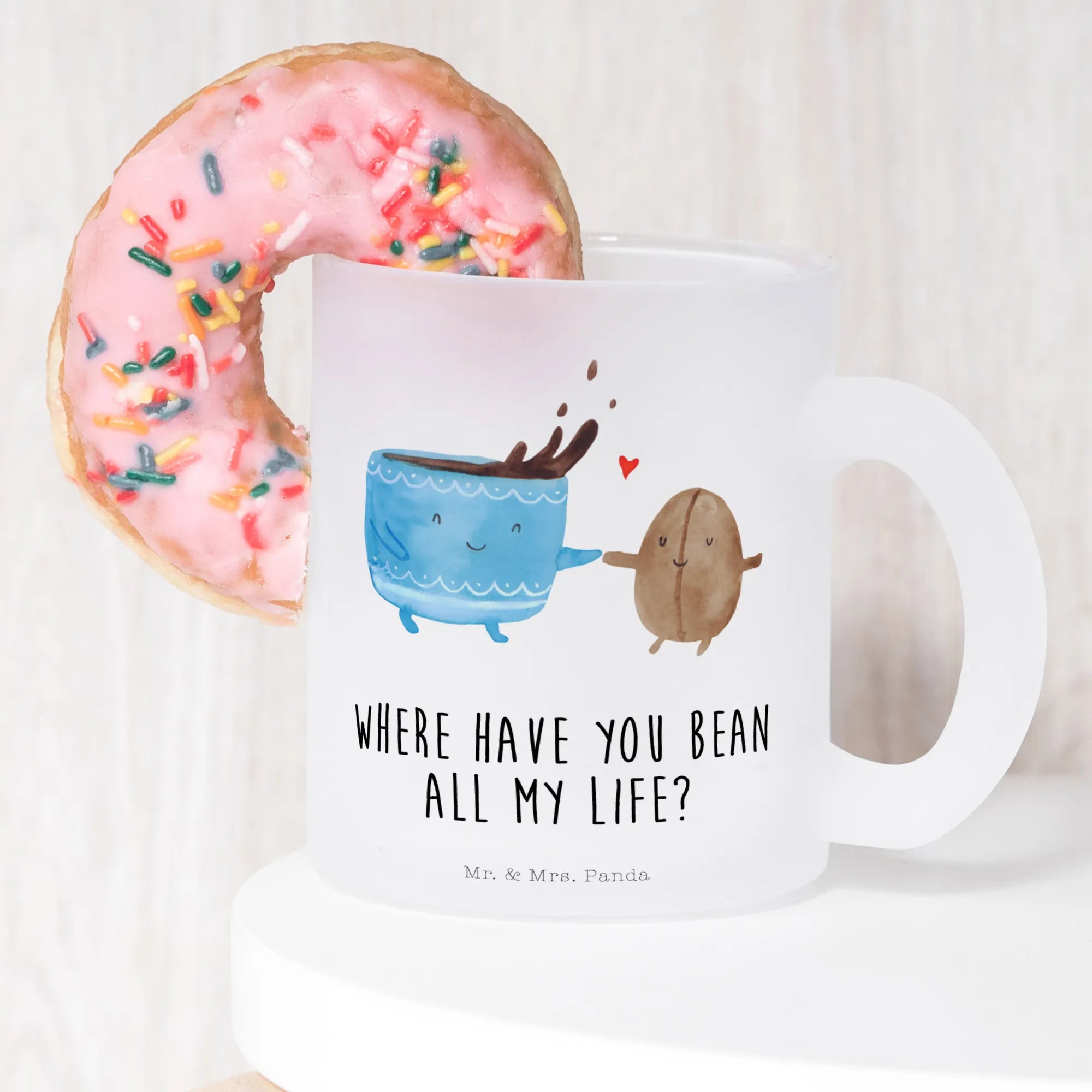 In einer liebevoll gezeichneten Szene präsentiert Mr. & Mrs. Panda eine Kaffeetasse, die eine Kaffeebohne fest an ihrer Seite hält. 'Where have you bean all my life?' - dieser Spruch spielt geschickt mit Worten und Emotionen und fängt die Essenz eines perfekt beginnenden Morgens ein. Diese Ikonographie spricht nicht nur Kaffee-Liebhaber direkt aus der Seele, sondern auch diejenigen, die im Leben kleine Zeichen der Freude und des Glücks suchen. Das Motiv adelt den alltäglichen Genuss einer Tasse Kaffee zur Liebeserklärung – eine Erinnerung, dass die schönsten Momente oft in den einfachsten Dingen verborgen liegen.