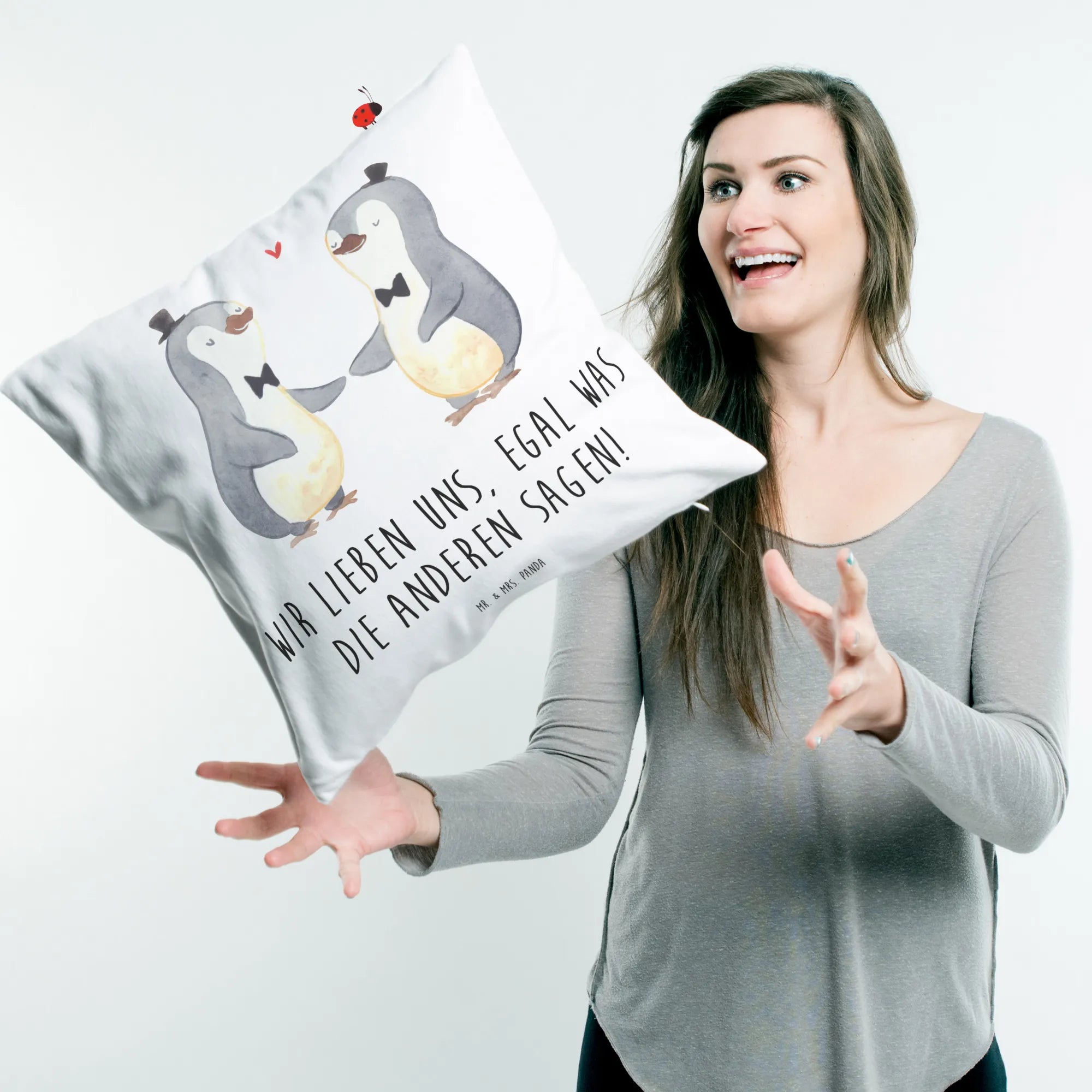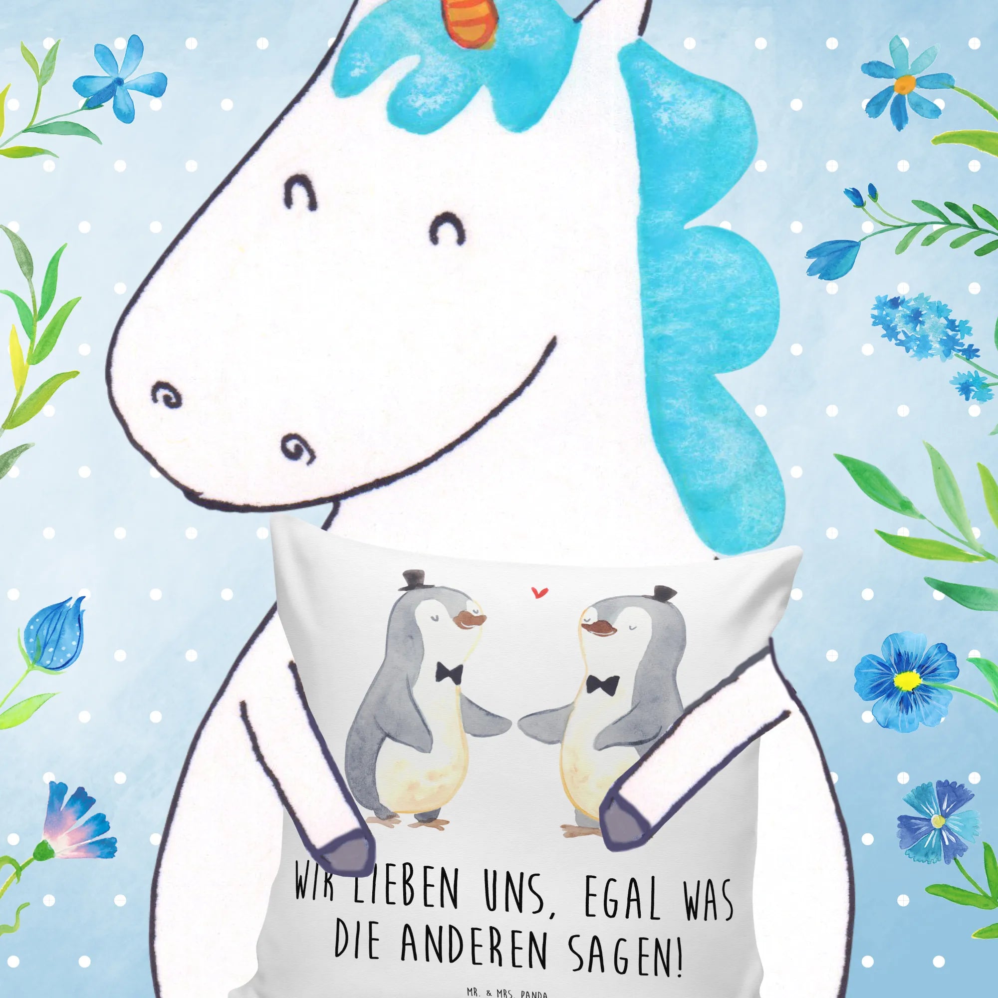 Das 40x40 Kissen "Pinguin Pärchen Gay Pride" von Mr. & Mrs. Panda ist das perfekte Geschenk für alle, die Liebe und Vielfalt feiern möchten! Dieses wunderschöne Kissen ist nicht nur ein Schmuckstück für jedes Zuhause, sondern auch ein Zeichen für Toleranz und Gleichheit. Die beiden süßen Pinguinmännchen, die stolz Händchen halten und schicke Hüte tragen, machen dieses Kissen zu einer besonderen Dekoration für Hochzeiten, Verlobungen oder einfach als liebevolle Geste für Freunde und Familie. Es passt perfekt zu deiner Sofakissen-Kollektion und kann sowohl als Dekokissen als auch als Kuschelkissen verwendet werden.