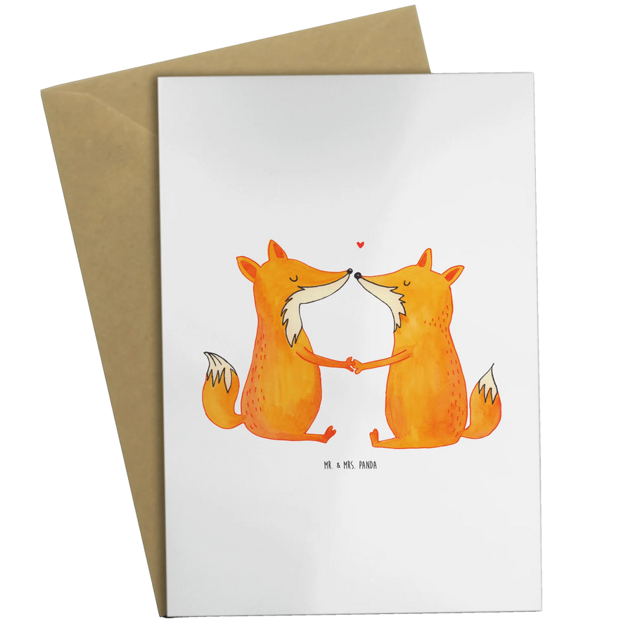 Die Grußkarte "Füchse Liebe" von Mr. & Mrs. Panda ist das perfekte Geschenk für alle, die ihre Zuneigung auf eine ganz besondere Art und Weise ausdrücken möchten. Ob zum Geburtstag, zur Hochzeit oder einfach mal so, diese einzigartige Klappkarte bringt ein Lächeln auf jedes Gesicht. Mit ihrem zauberhaften Design, das zwei süße Füchse zeigt, die Hand in Hand sitzen, strahlt sie pure Liebe und Verbundenheit aus. Das Motiv der Füchse aus unserer Fuchs-Kollektion ist nicht nur niedlich, sondern auch signifikant – es spiegelt die Geselligkeit und die familiären Werte wider, die typisch für diese tollen Tiere sind.