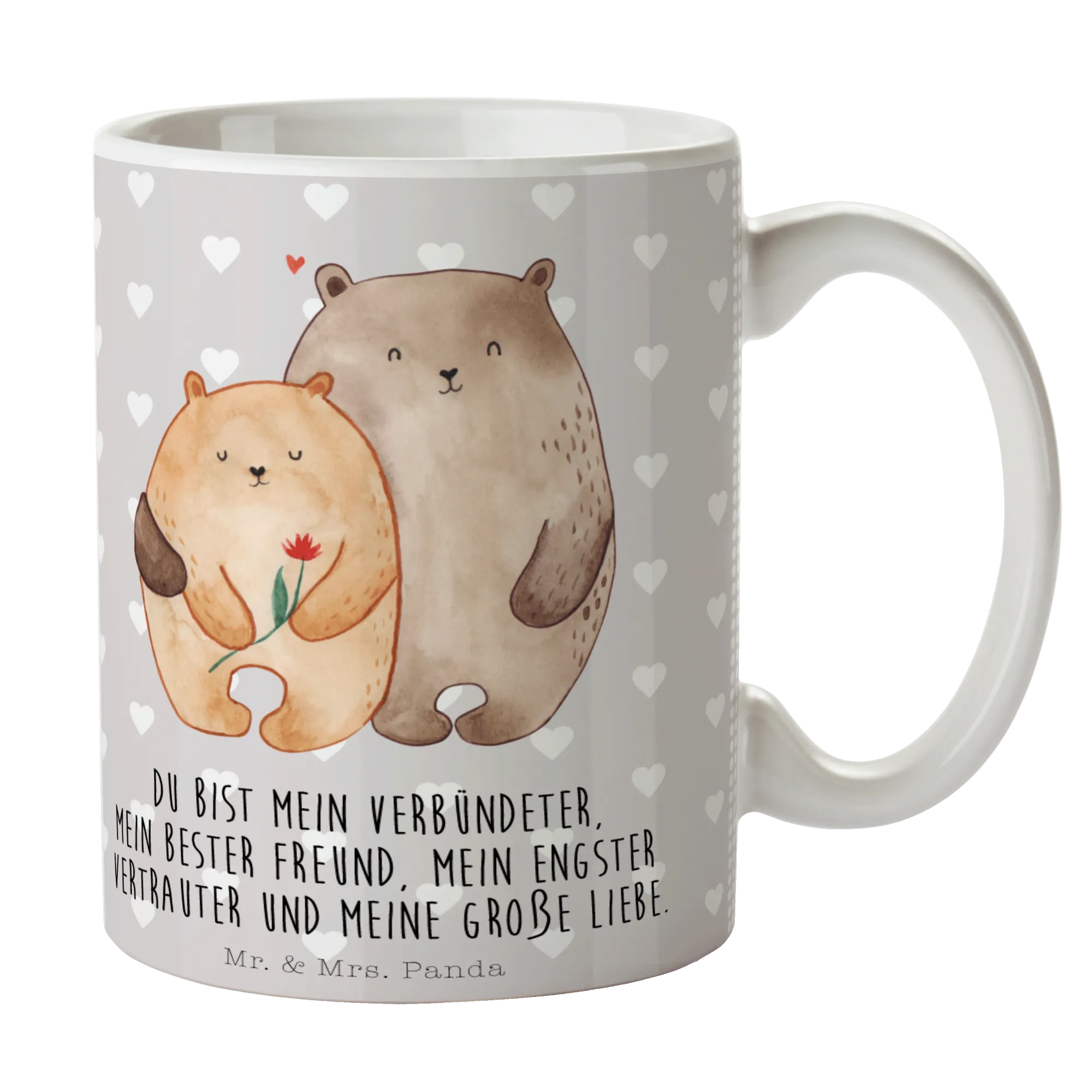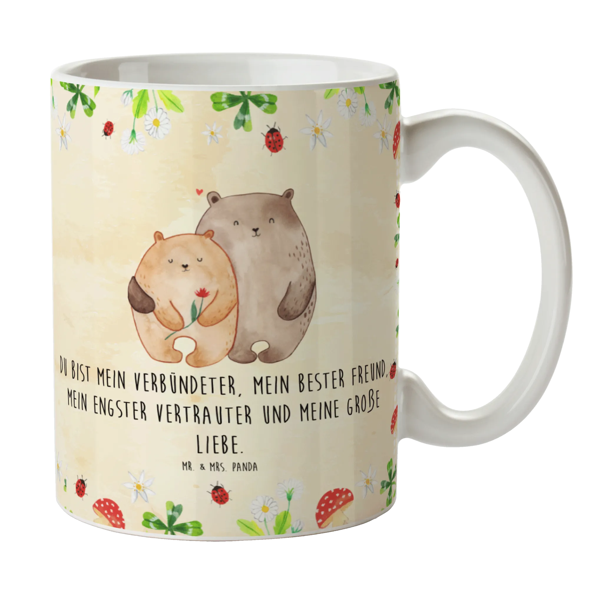Mr. & Mrs. Panda Tasse „Bären Liebe“ – ein kleines, großes Geschenk für Verliebte. Diese Kaffeetasse mit Spruch zeigt zwei niedliche Bären, die zusammen ein Herz formen. Der liebevolle Text „Du bist mein Verbündeter, Mein bester Freund, mein engster Vertrauter und meine große Liebe.“ macht die Tasse zum perfekten Liebesgeschenk für Freundin, Freund oder den Ehepartner.
