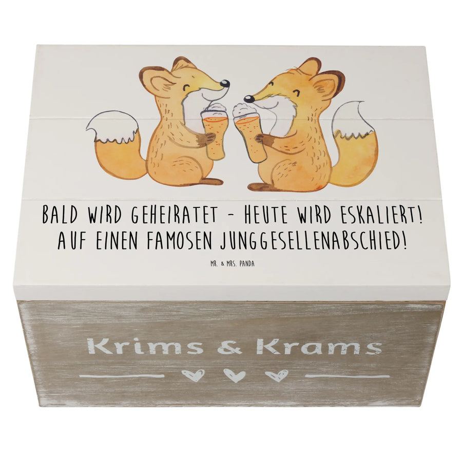 Entdecke die zauberhafte Holzkiste von Mr. & Mrs. Panda - ein echtes Highlight für jeden Junggesellenabschied! Mit dem spritzigen Spruch 'Bald wird geheiratet - heute wird eskaliert! Auf einen famosen Junggesellenabschied!' ist diese wunderschöne Schatzkiste nicht nur ein toller Blickfang, sondern auch das perfekte Erinnerungsstück für diesen ganz besonderen Tag.