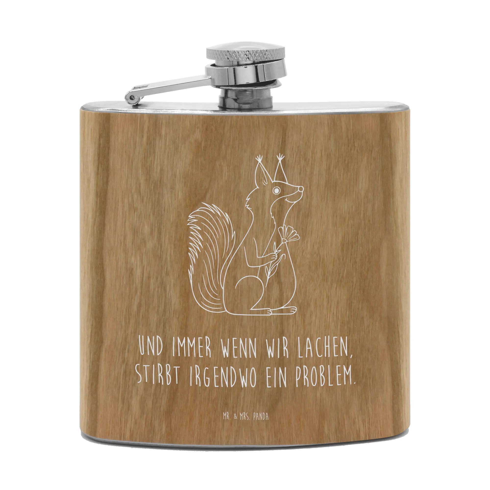 Genieße deine Lieblingsgetränke stilvoll mit dem Flachmann von Mr. & Mrs. Panda. Mit den perfekten Abmessungen von 109 mm x 93 mm x 22 mm und einem Füllvolumen von 150 ml ist dieser Flachmann nicht nur praktisch, sondern auch ein echter Blickfang. Der Edelstahl, umhüllt mit Holzlaminat, gibt dem Flachmann eine besonders edle Note. Die humorvolle Gravur mit Motiven, die Freude bereiten, macht ihn zum idealen Begleiter für Junggesellenabschiede, Wandertouren oder entspannte Ausflüge mit Freunden. Super leicht und ideal zu transportieren, passt er in jede Tasche. Der Flachmann liegt gut in der Hand und ist mit einem sicheren Schraubverschluss ausgestattet, der ein Auslaufen verhindert. Achte darauf, ihn nur mit heißem Wasser zu reinigen, denn er ist nicht spülmaschinenfest!