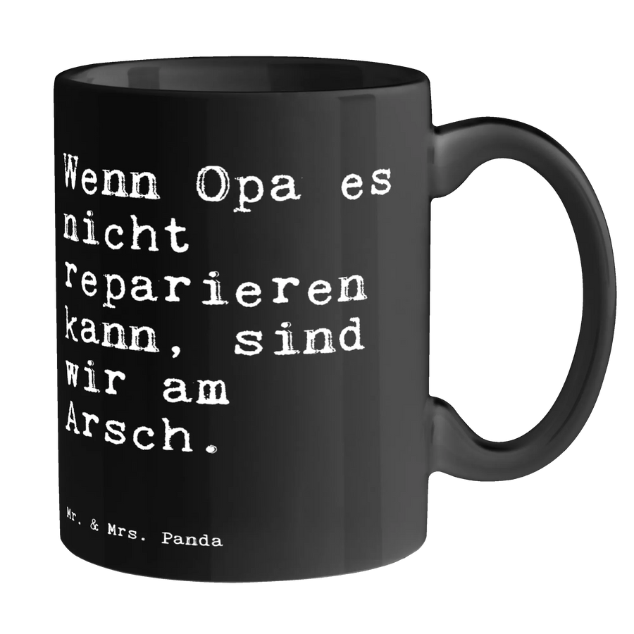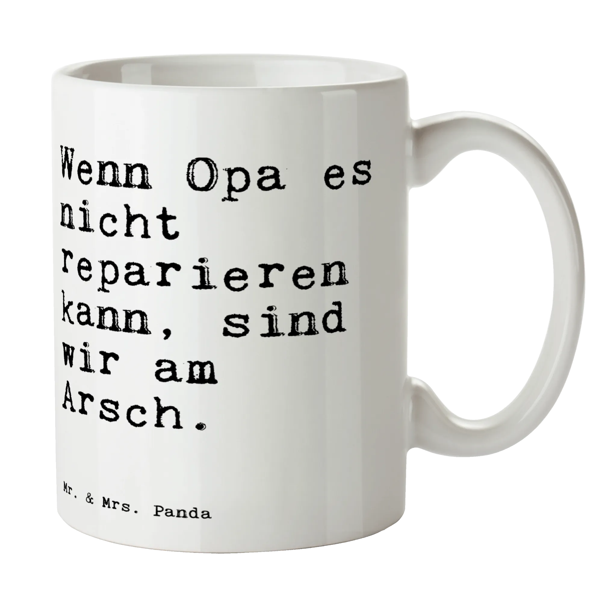 Suchst du das perfekte Geschenk für den besten Opa der Welt? Dann ist unsere wunderschöne Keramiktasse mit dem Spruch "Wenn Opa es nicht reparieren kann, sind wir am Arsch." genau das Richtige! Diese Tasse gehört zur Spruchreif Kollektion von Mr. & Mrs. Panda, die für ihre herzlichen und niedlichen Sprüche bekannt ist.