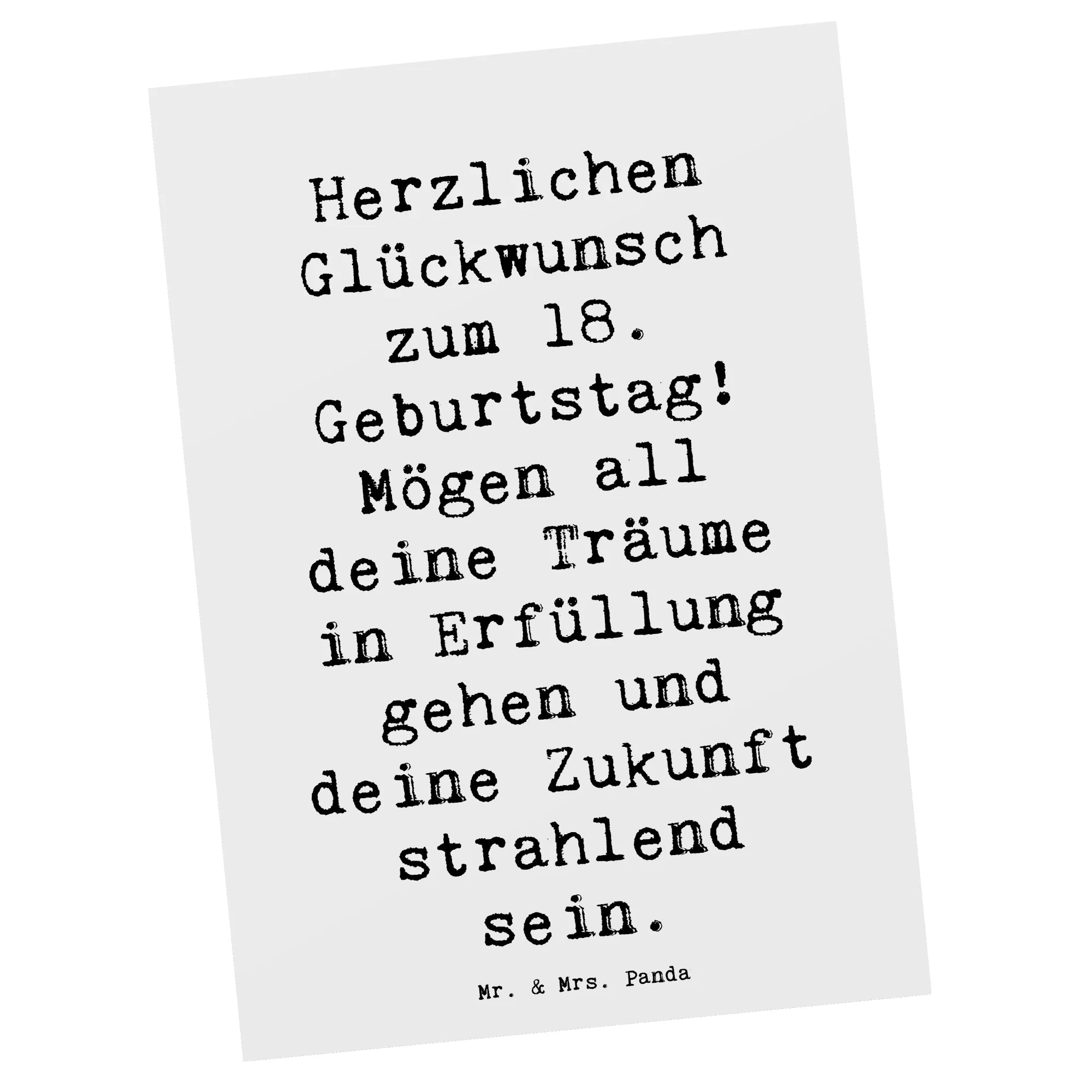 Jeder weiß, der 18. Geburtstag ist ein großer Meilenstein im Leben - der Übergang ins Erwachsenenleben! Egal ob du die Karte für deinen besten Freund, deine Schwester oder deinen Sohn kaufst, sie wird garantiert für ein Lächeln auf dem Gesicht des Geburtstagskindes sorgen. Unsere Postkarte kommt mit einem niedlichen und fröhlichen Design, das aus der kreativen Feder von Mrs. Panda stammt und liebevoll handgezeichnet wurde. Die Aquarell-Motive und lebensfrohen Sprüche machen sie zu einem echten Hingucker!