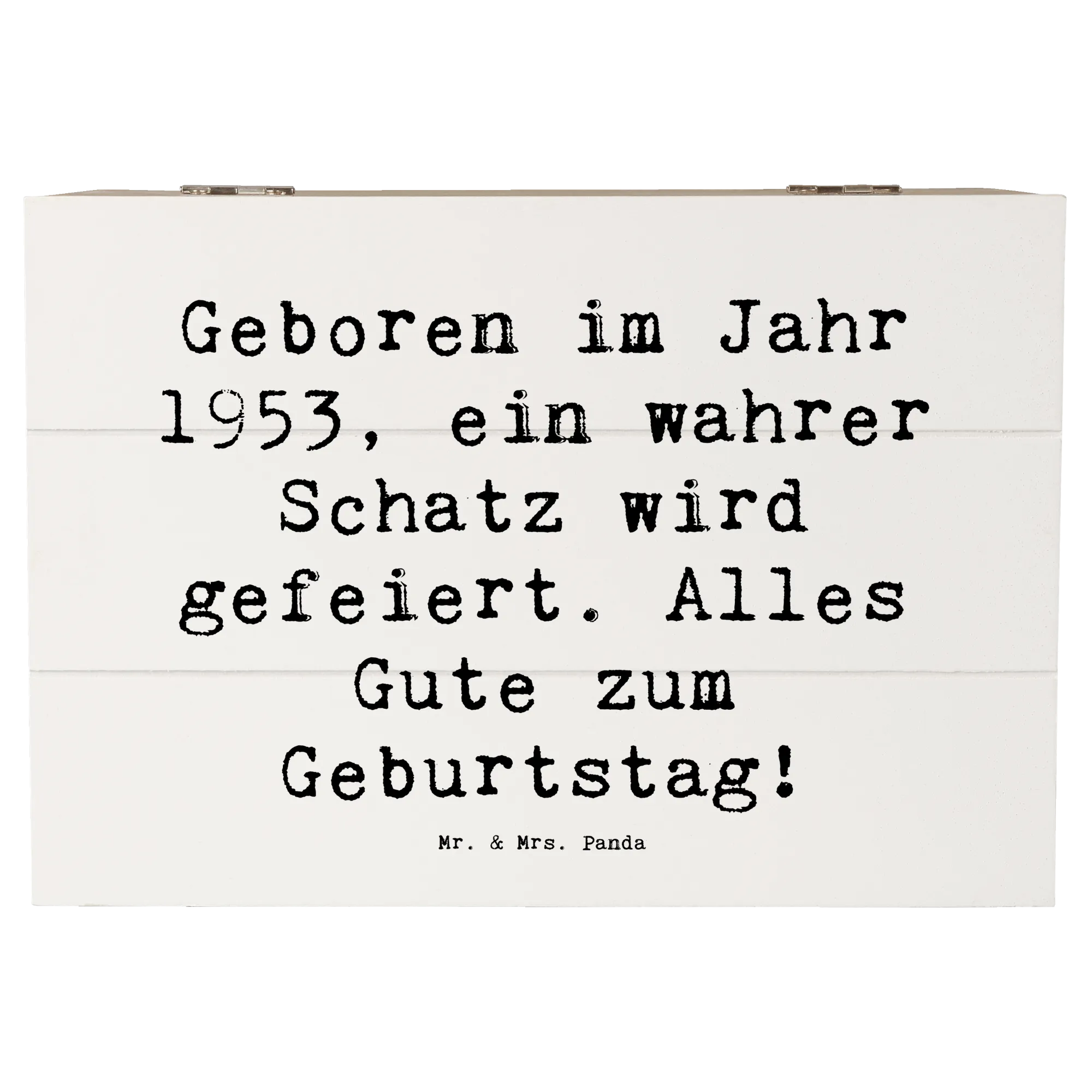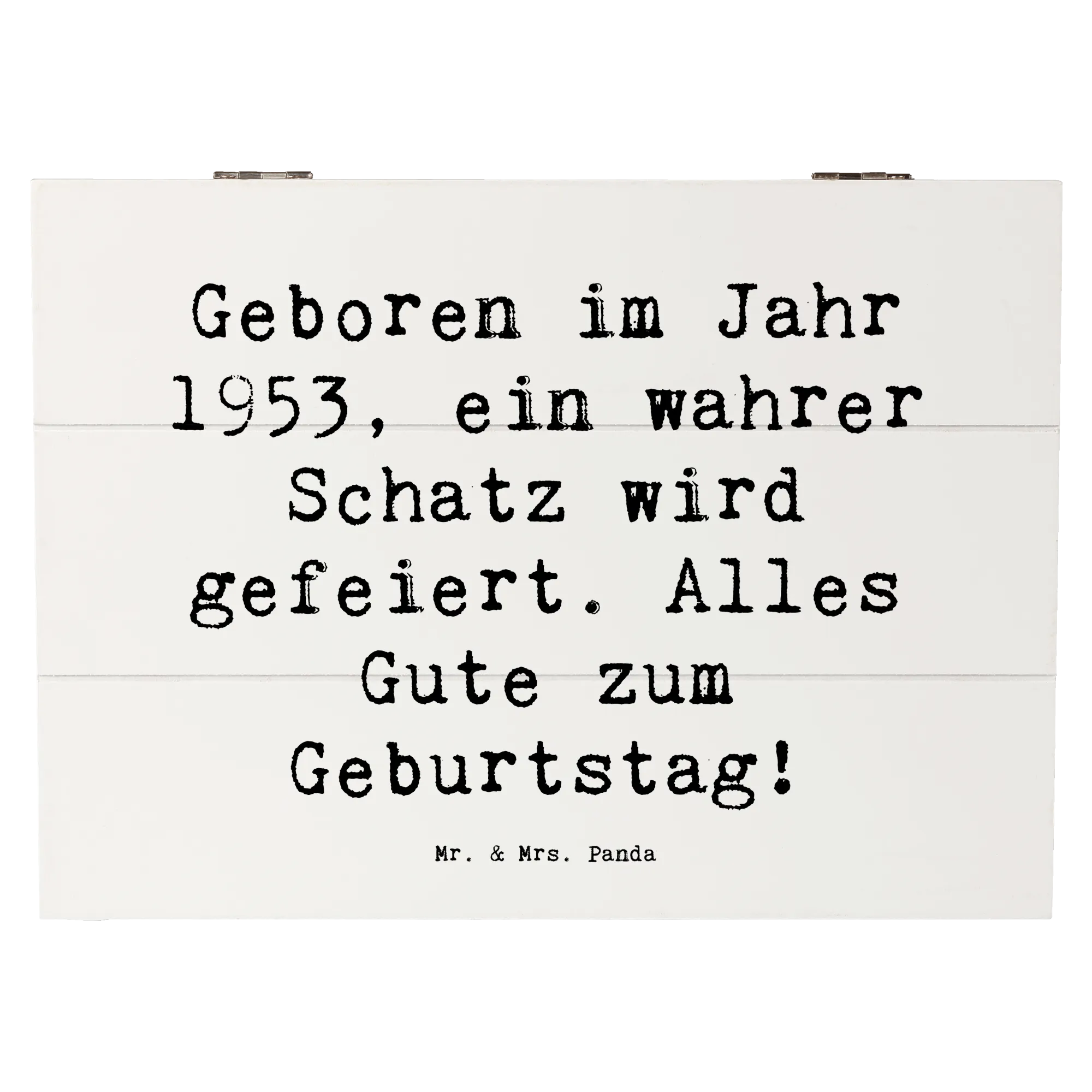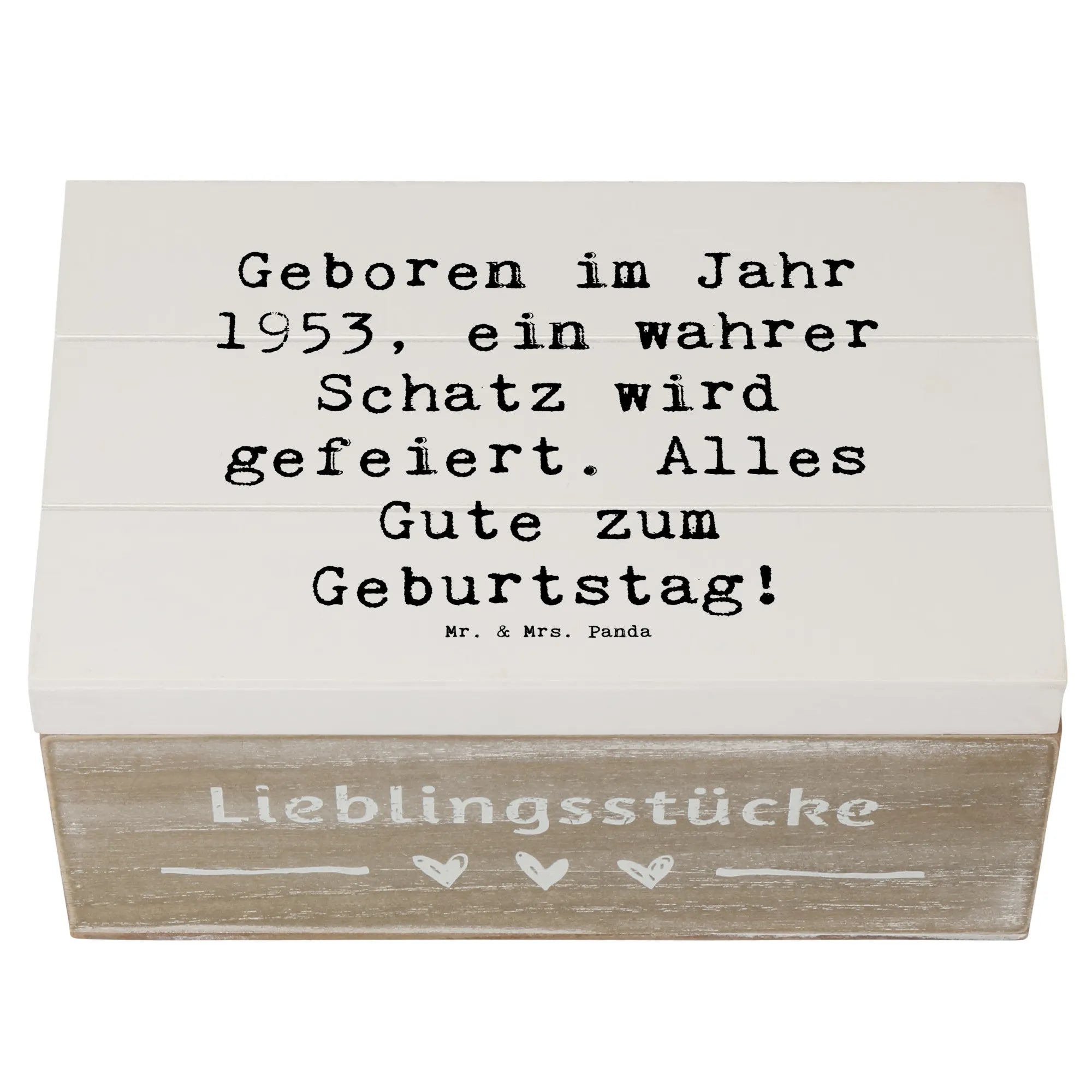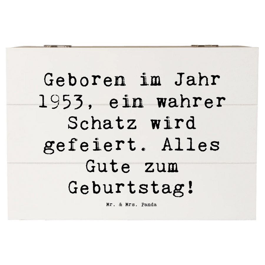 Die wunderschöne Holzkiste aus der Kollektion "Geburtstag Geburtsjahr" von Mr. & Mrs. Panda ist das perfekte Geschenk für jeden, der 1953 geboren wurde. Mit dem motivierenden Slogan "Geboren im Jahr 1953, ein wahrer Schatz wird gefeiert. Alles Gute zum Geburtstag!" macht diese Erinnerungskiste jeden Geburtstag zu einem besonderen Anlass.