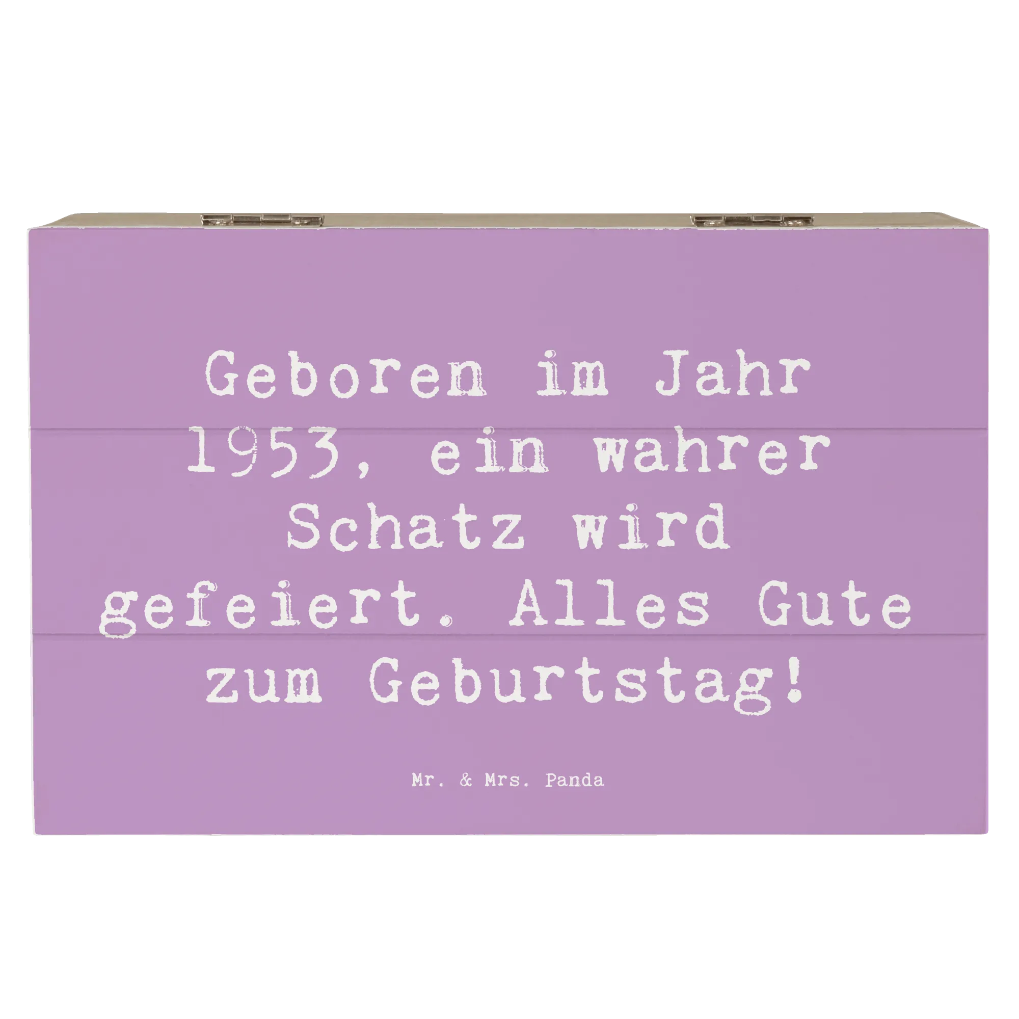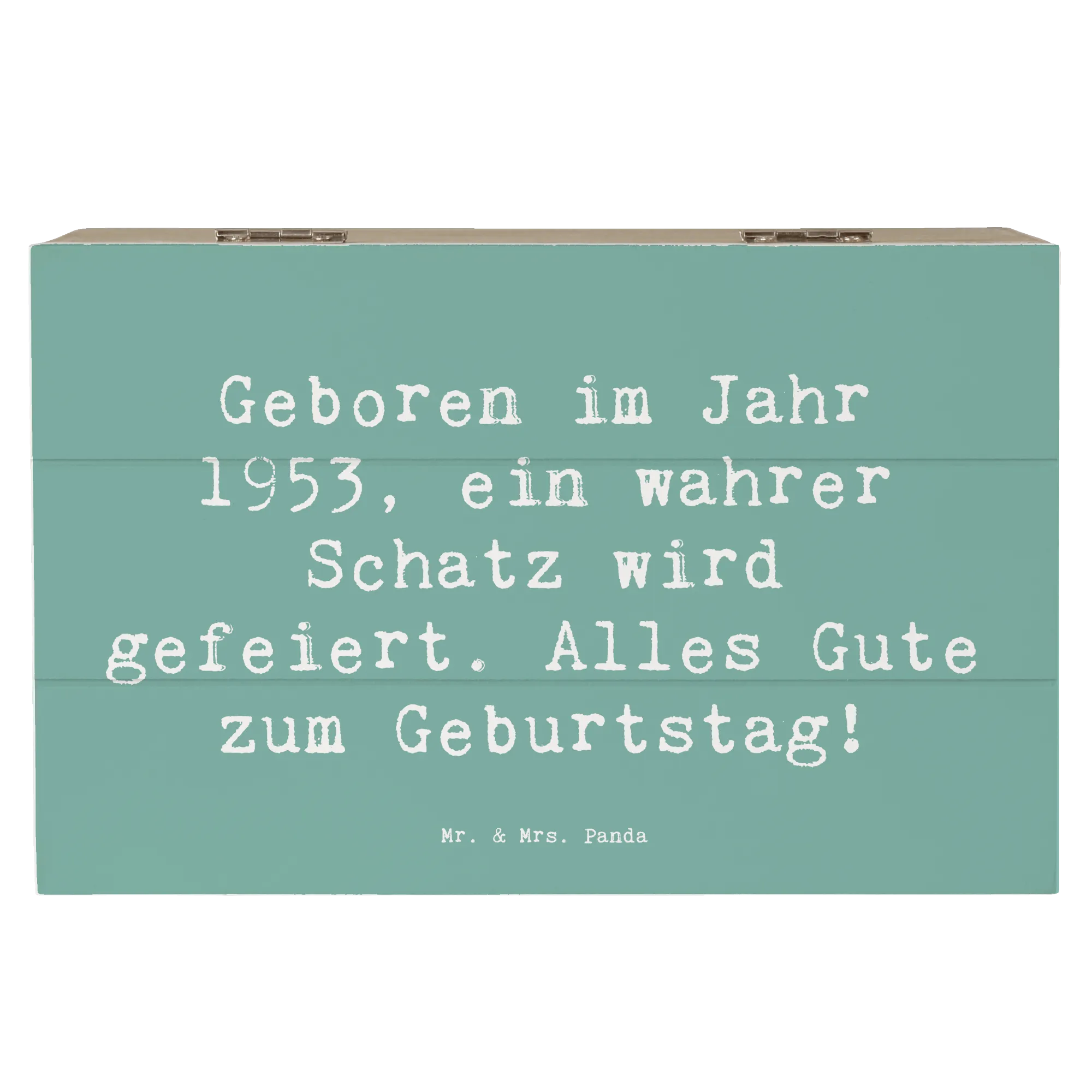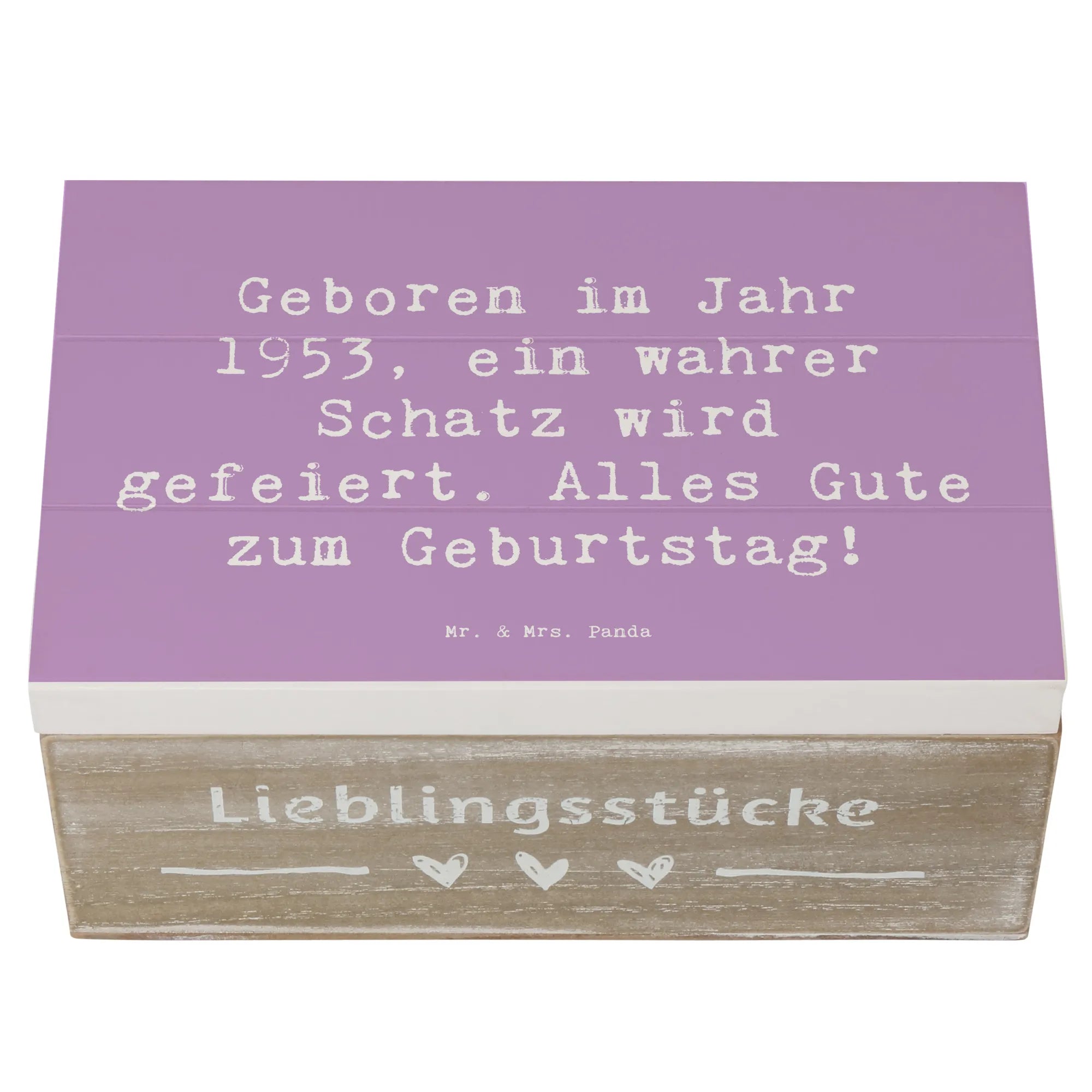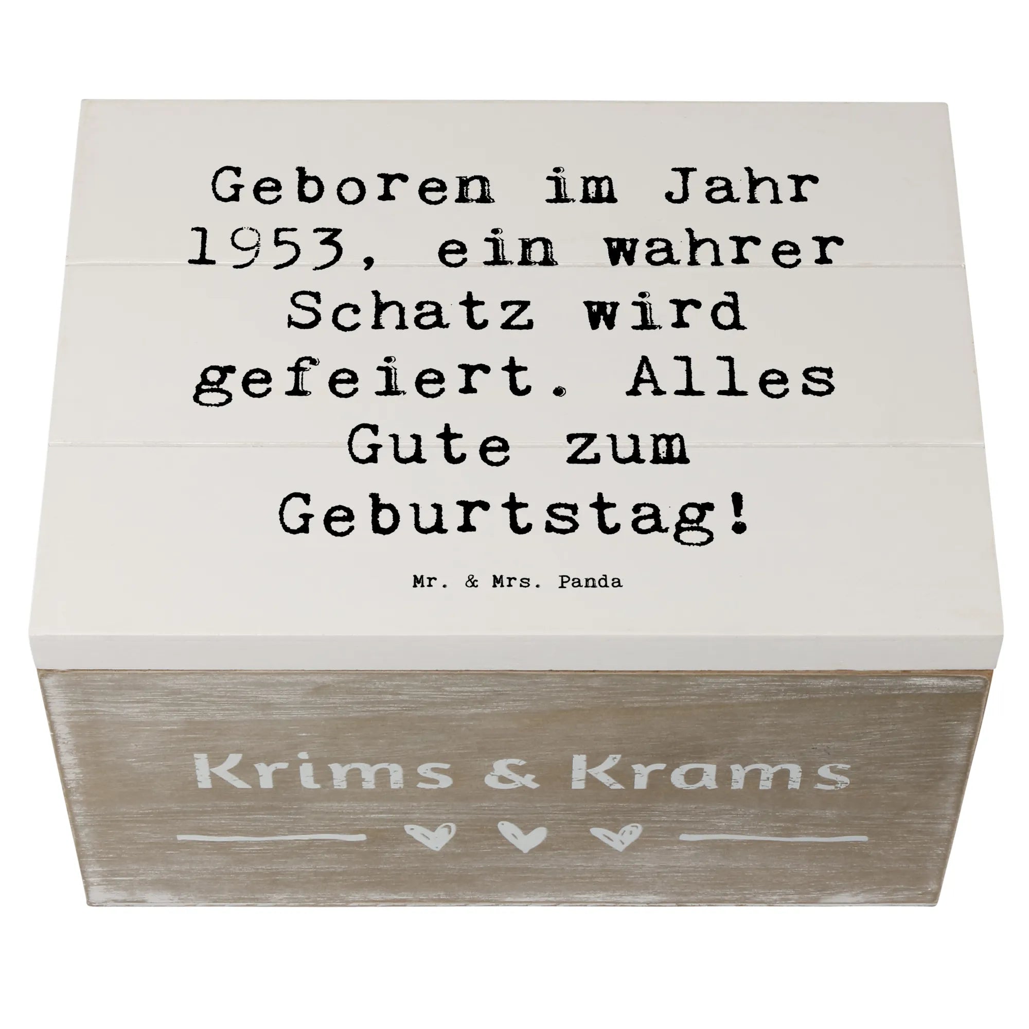 Die wunderschöne Holzkiste aus der Kollektion "Geburtstag Geburtsjahr" von Mr. & Mrs. Panda ist das perfekte Geschenk für jeden, der 1953 geboren wurde. Mit dem motivierenden Slogan "Geboren im Jahr 1953, ein wahrer Schatz wird gefeiert. Alles Gute zum Geburtstag!" macht diese Erinnerungskiste jeden Geburtstag zu einem besonderen Anlass.