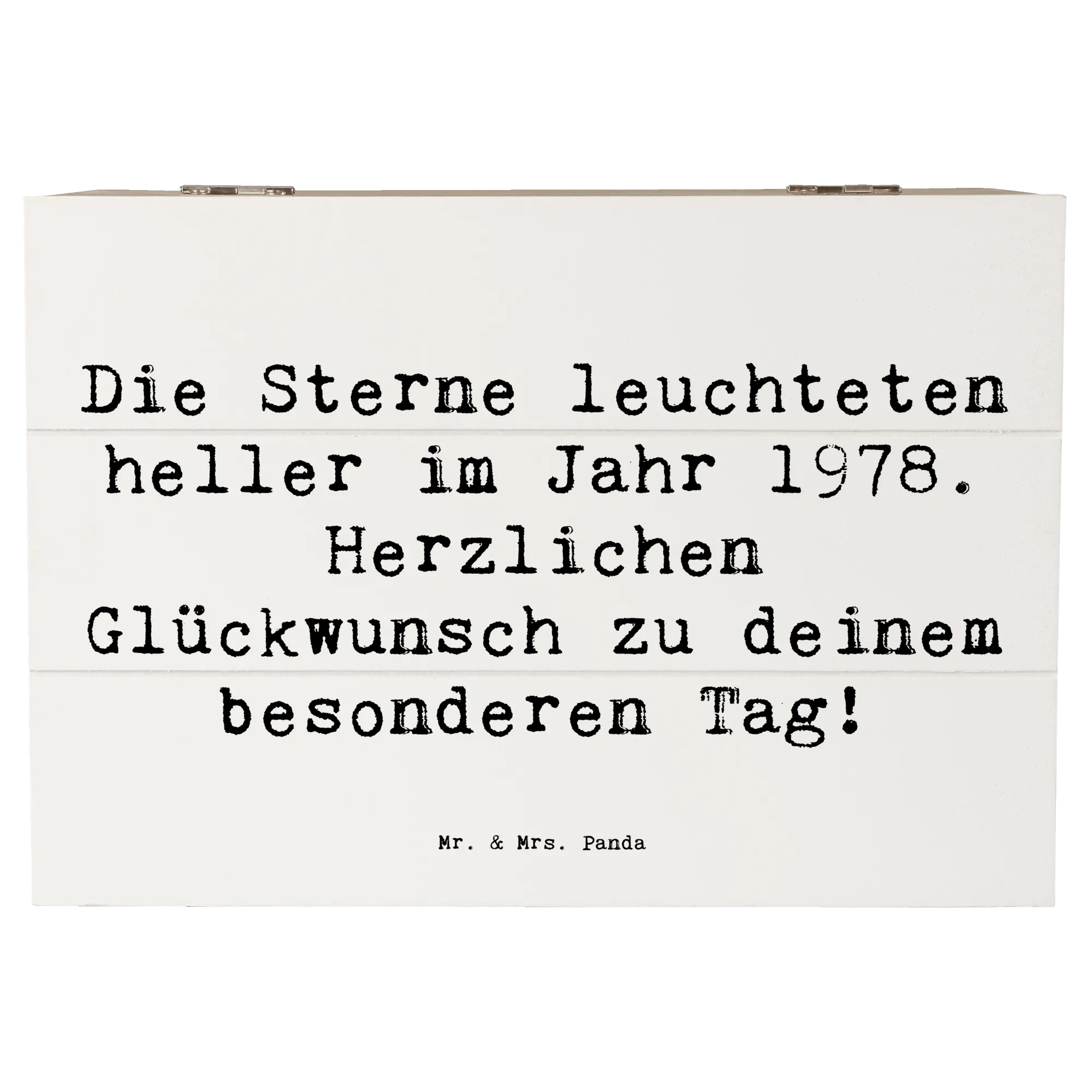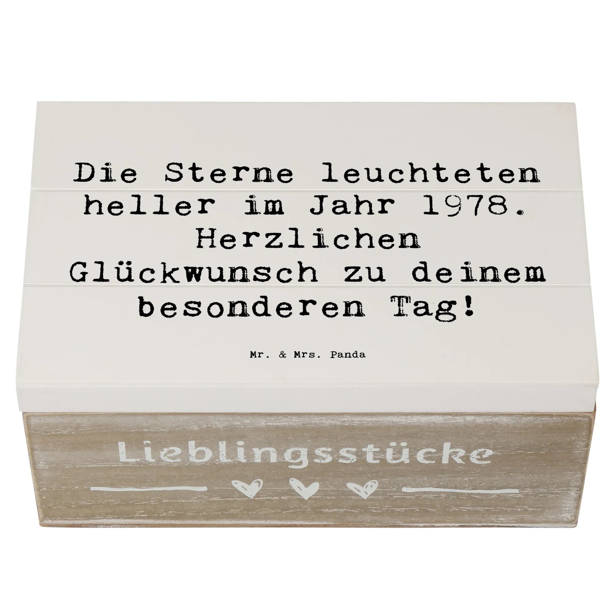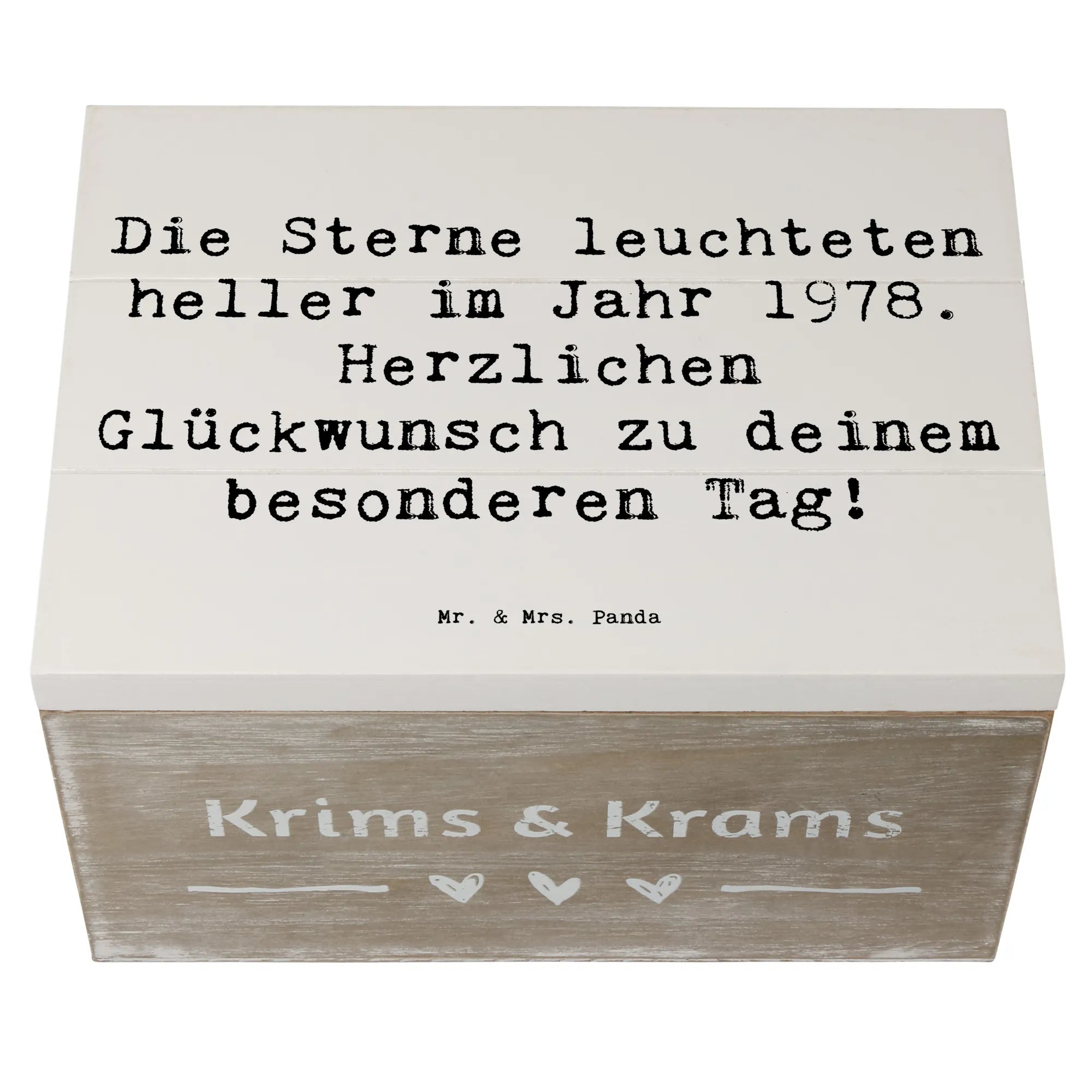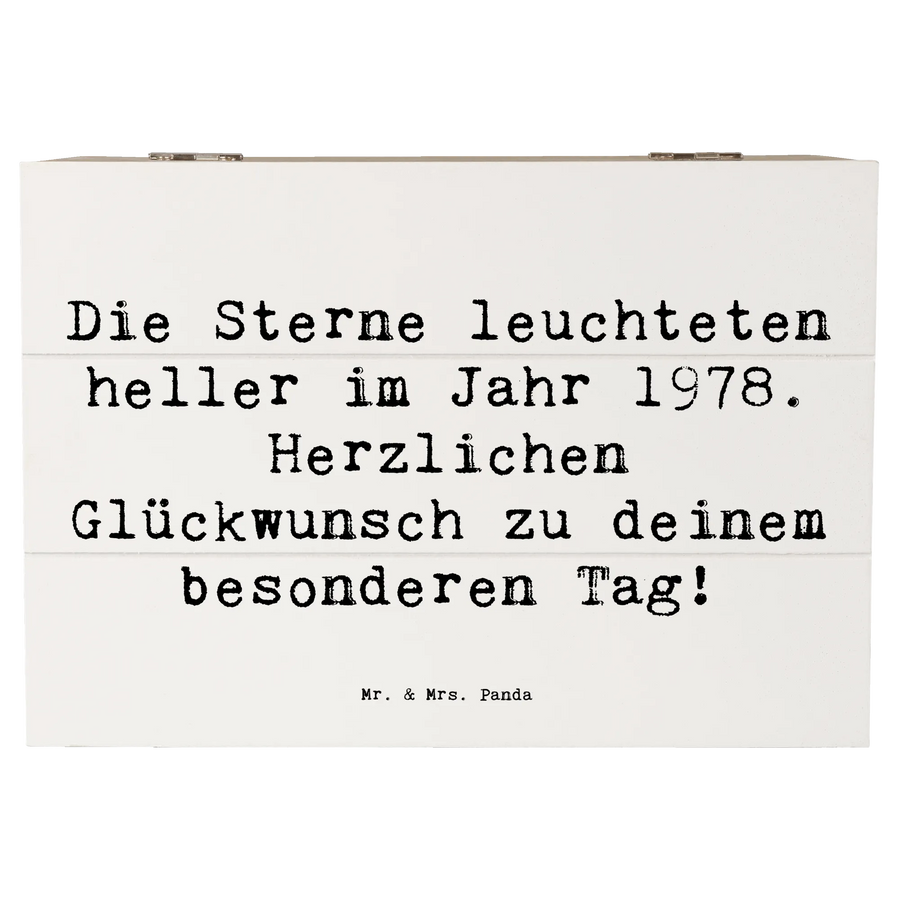 Die wunderschöne Holzkiste von Mr. & Mrs. Panda ist das perfekte Geschenk für alle, die 1978 Geburtstag feiern! Mit dem liebevollen Motto "Die Sterne leuchteten heller im Jahr 1978. Herzlichen Glückwunsch zu deinem besonderen Tag!" wird diese Erinnerungskiste schnell zum wertvollen Aufbewahrungsort für besondere Schätze.