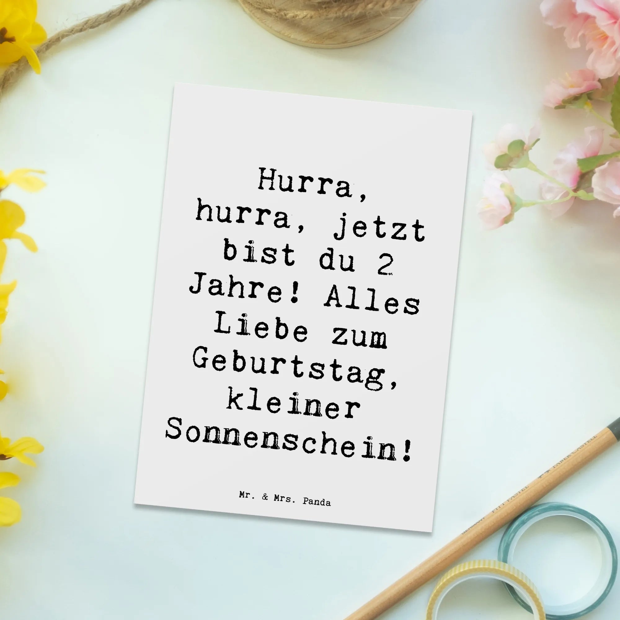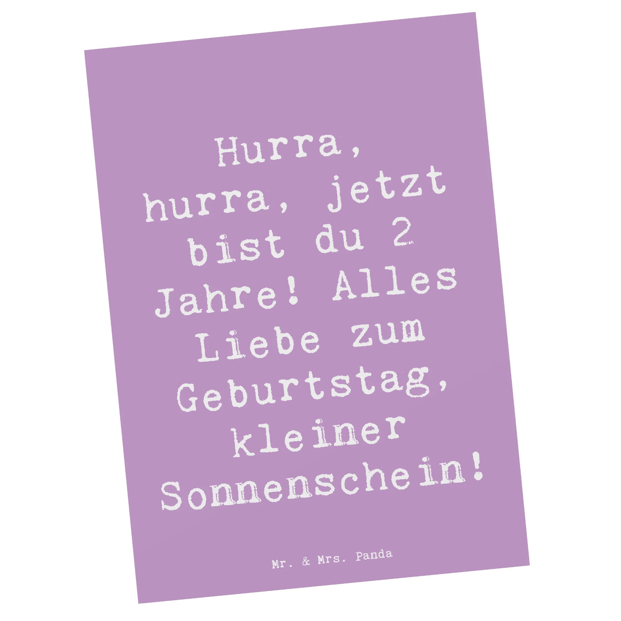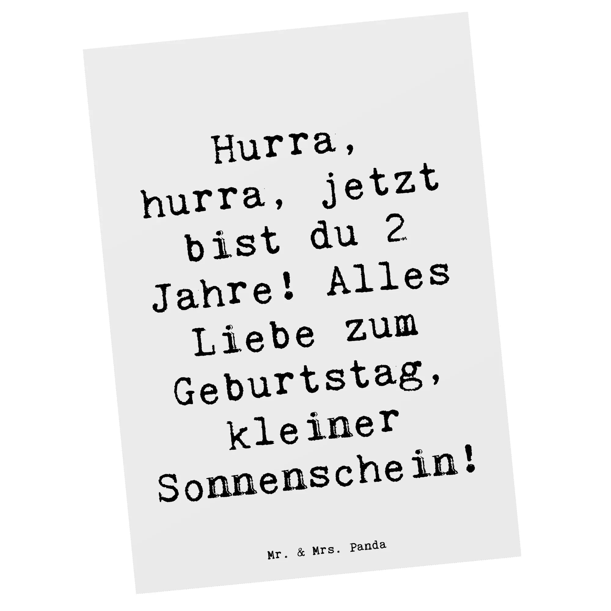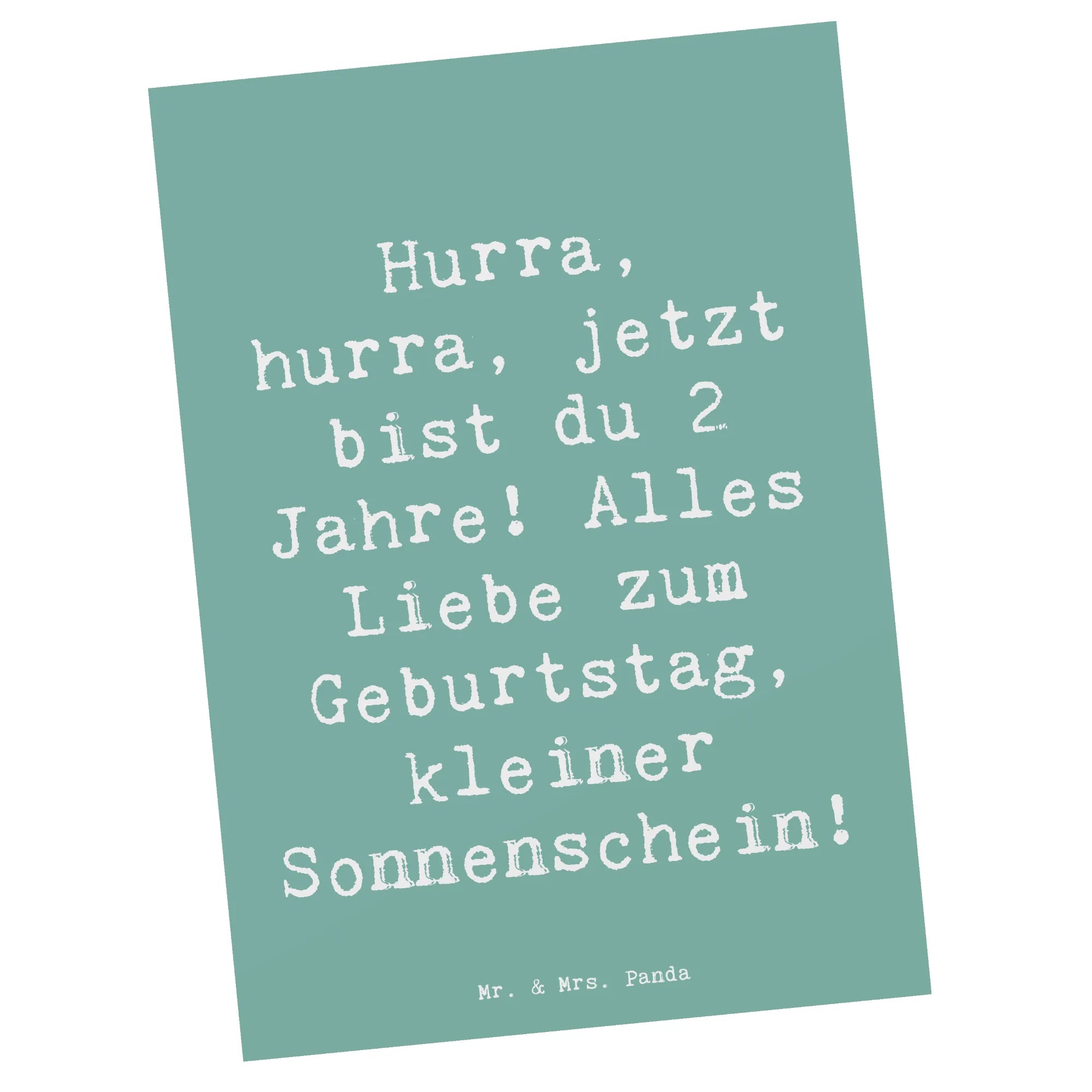 Eine bezaubernde Postkarte zum 2. Geburtstag von Mr. & Mrs. Panda. Mit dem fröhlichen Spruch „Hurra, hurra, jetzt bist du 2 Jahre! Alles Liebe zum Geburtstag, kleiner Sonnenschein!“ zaubert diese Karte sofort ein Lächeln. Das handgezeichnete Aquarell-Motiv von Mrs. Panda und die beruhigende Hintergrundfarbe Meeresbrise machen sie zu einem liebevollen Begleiter für diesen besonderen Tag.