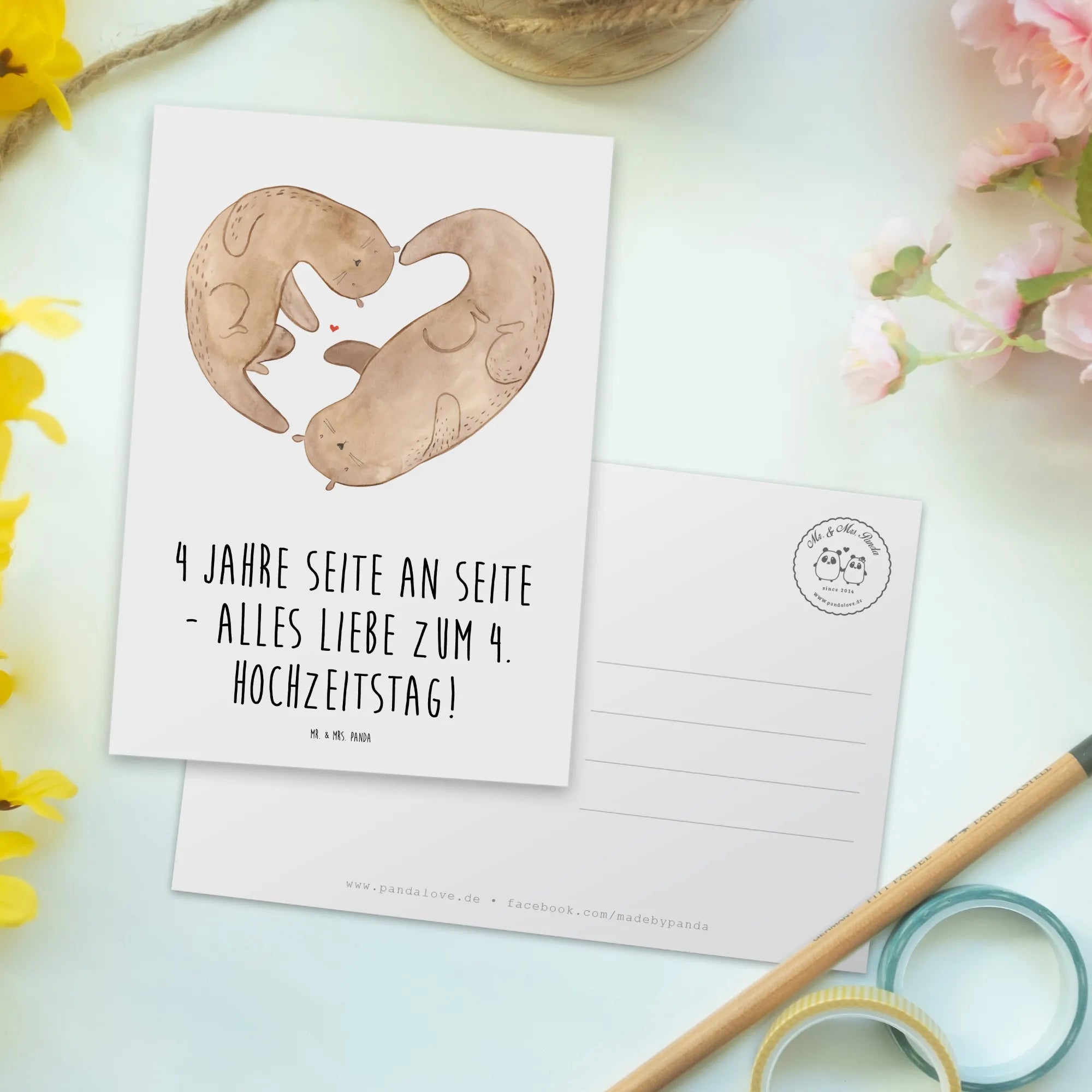 Die einzigartige Postkarte "4 Jahre Seite an Seite - alles Liebe zum 4. Hochzeitstag!" von Mr. & Mrs. Panda ist das perfekte Geschenk, um diesen besonderen Moment in der Liebe zu feiern. Sie ist ideal für Verliebte, die ihre 4. Hochzeitstagsfeier unvergesslich machen möchten oder für Freunde, die nach einem herzlichen Gruß suchen. Mit ihrem niedlichen, romantischen Design und dem liebevollen Spruch wird sie sicher jeden in ihren Bann ziehen. Die Karte hat eine hochglänzend veredelte Vorderseite, die ein echter Blickfang ist, und eine matte Rückseite, die sich perfekt zum Beschriften eignet.