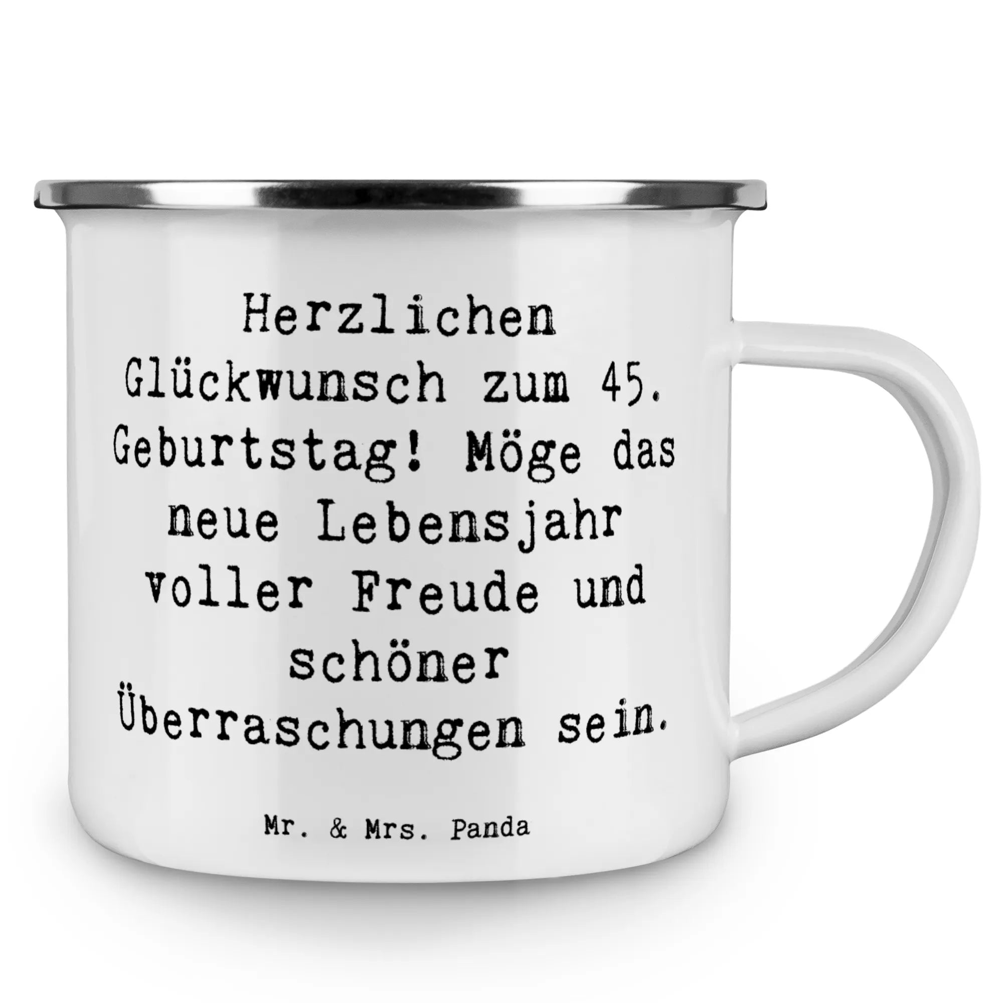 Diese wunderbare Camping Emaille Tasse von Mr. & Mrs. Panda ist das perfekte Geschenk zum 45. Geburtstag! Mit dem liebevollen Spruch "Herzlichen Glückwunsch zum 45. Geburtstag! Möge das neue Lebensjahr voller Freude und schöner Überraschungen sein." bringt diese Tasse nicht nur Freude, sondern auch einen Hauch von Persönlichkeit in die Outdoor-Erlebnisse deiner Liebsten.